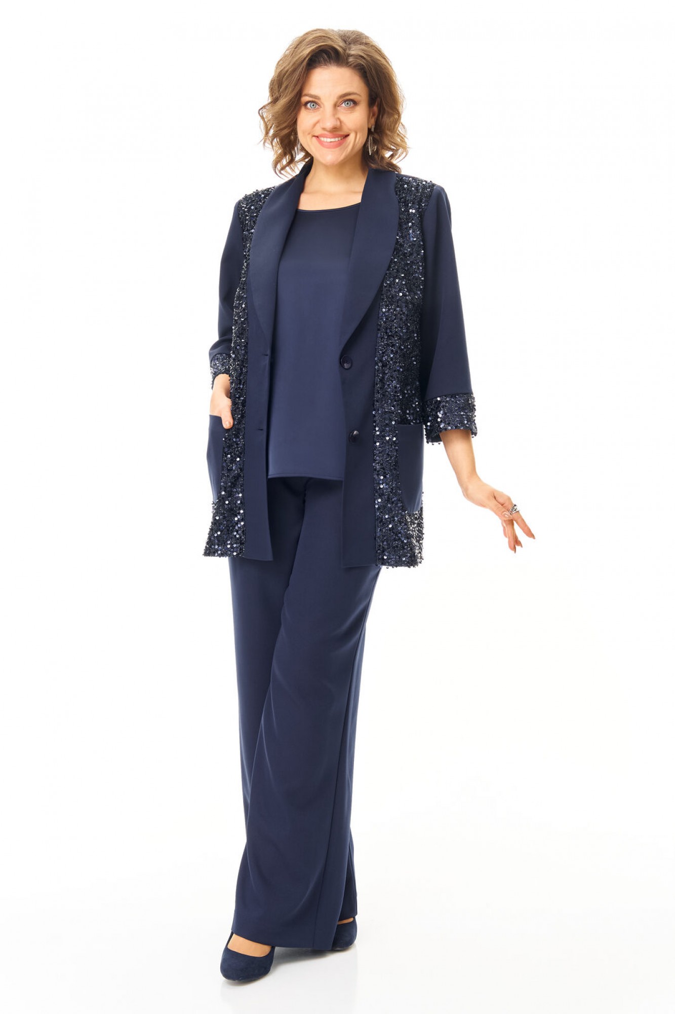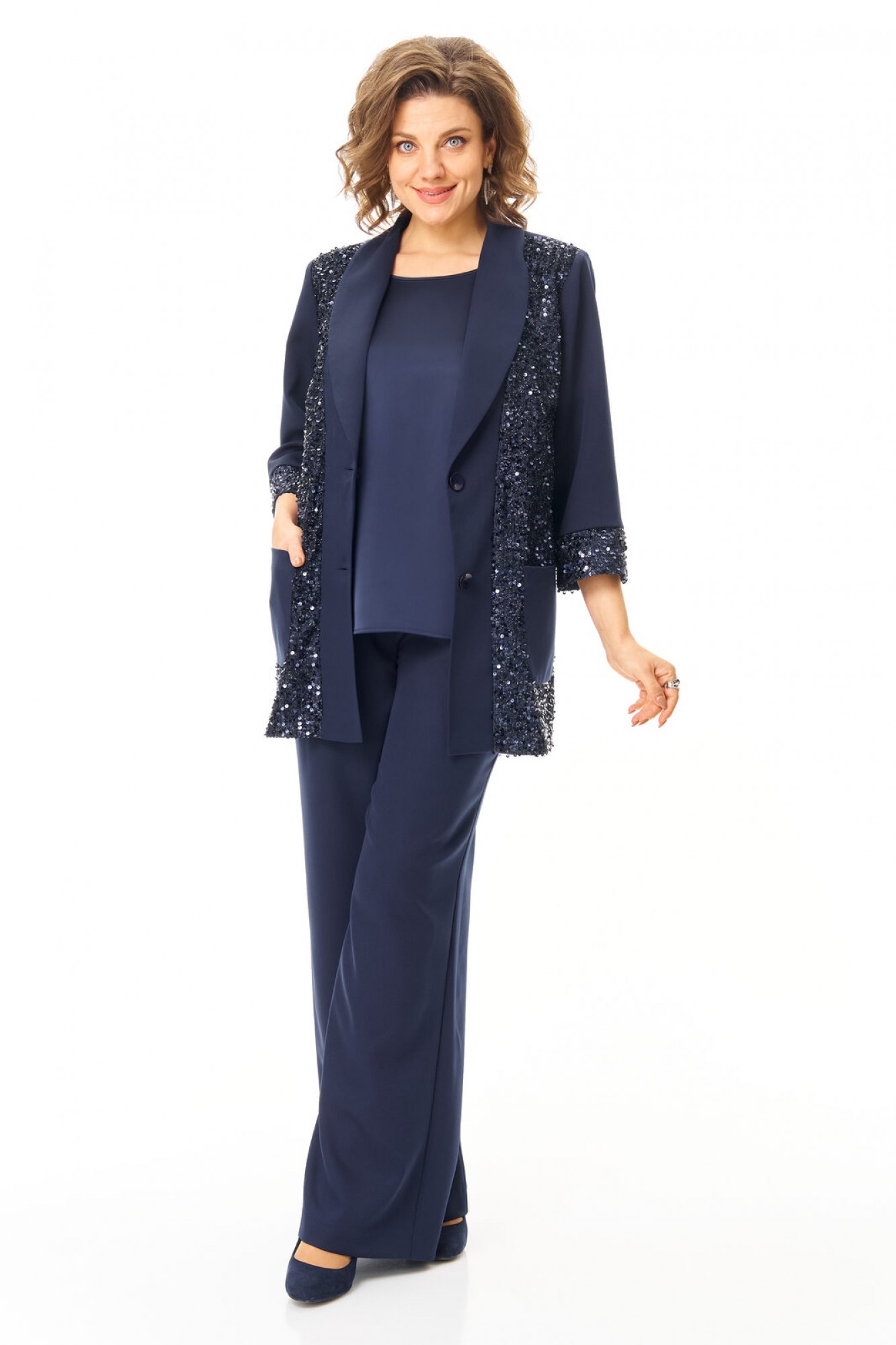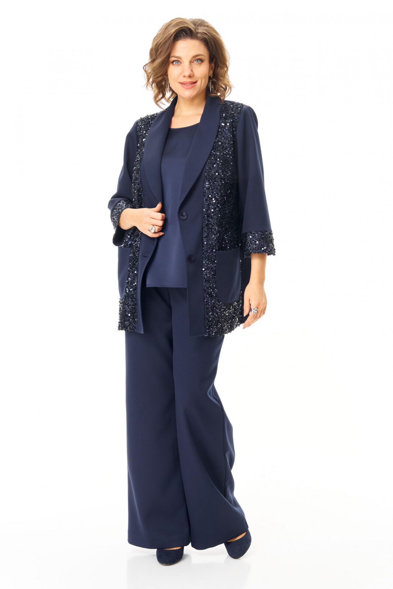Комплект женский состоит из жакета, топа и брюк. Жакет свободного покроя с естественной линией плеча. Рукав втачной одношовный длиной 3/4 с манжетой из отделочной ткани "пайетки". Перед выполнен из отделочной ткани "пайетки" на атласной подкладке. Обработаны отрезные планки. Застежка центрально-бортовая на петли пуговицы. Воротник отложной типа "шаль". На переде выполнены накладные карманы. Топ свободного покроя из атласной ткани. Горловина округлой формы. Брюки расширенные к низу типа "палаццо" с центральной застёжкой на молнию и петлю-пуговицу. В боковых швах карманы с отрезным бочком. Пояс притачной с резинкой по задней части пояса. В комплект входит съёмный пояс.