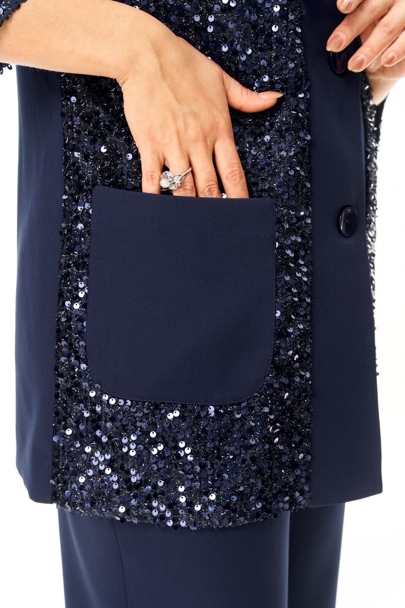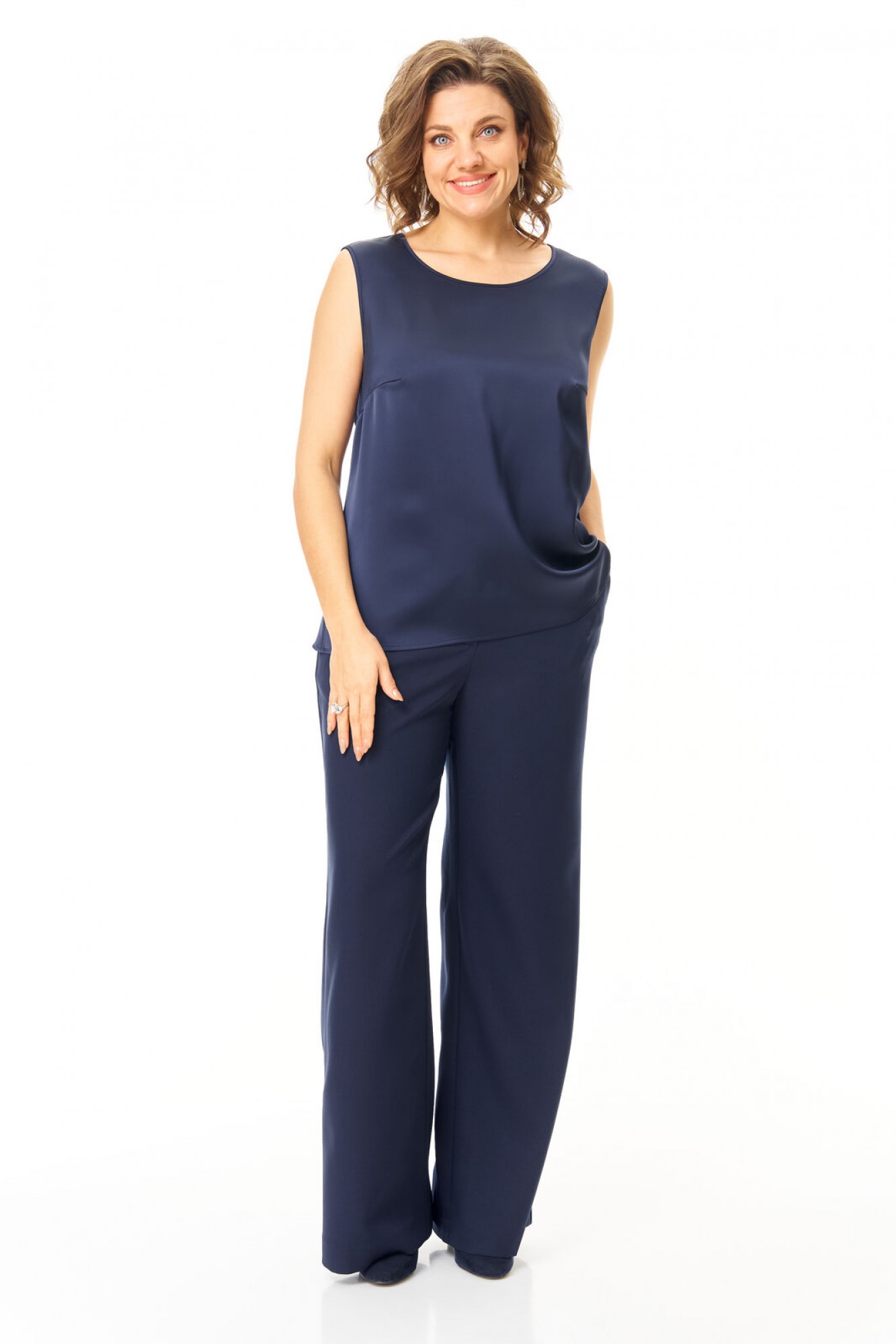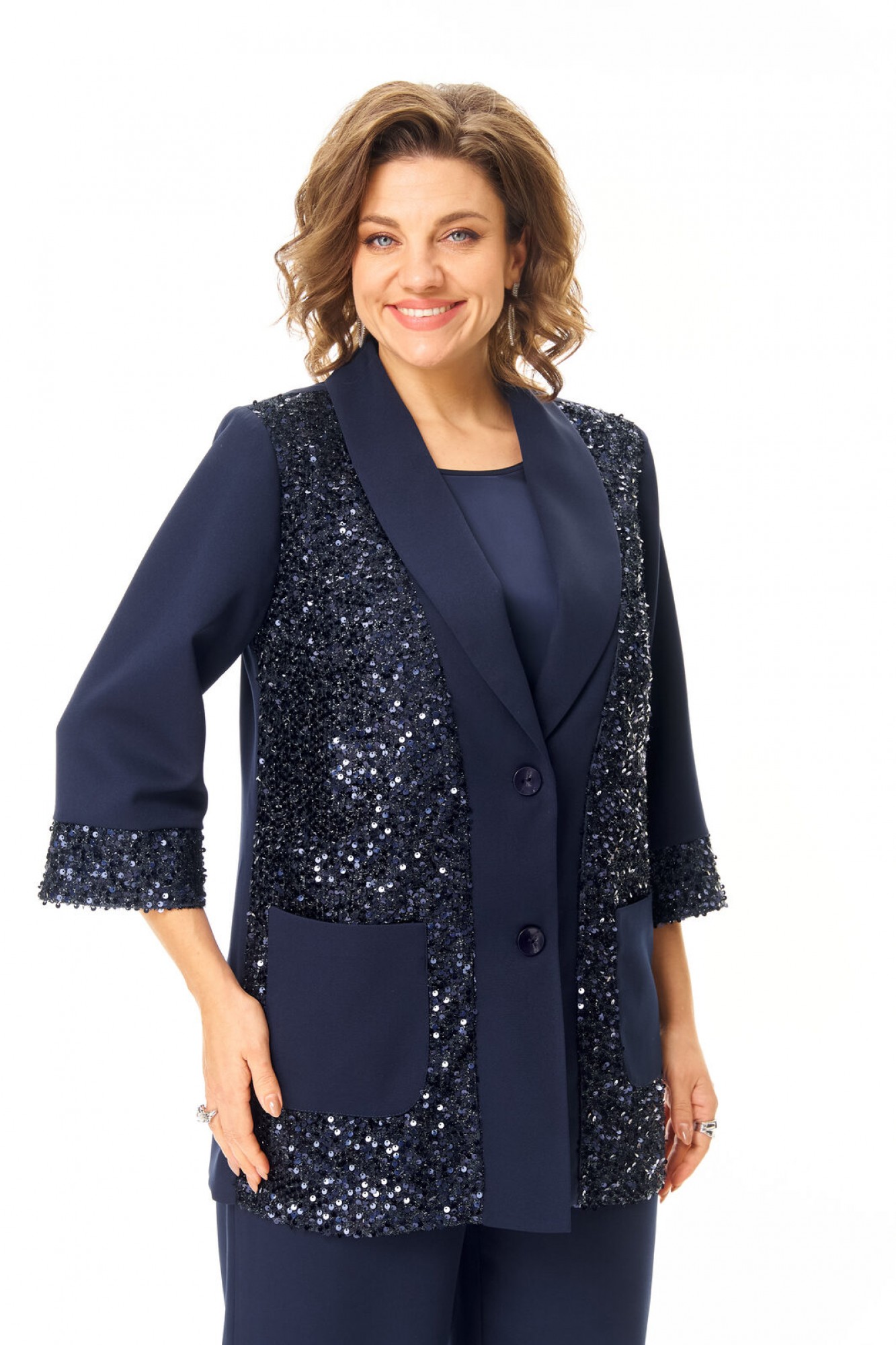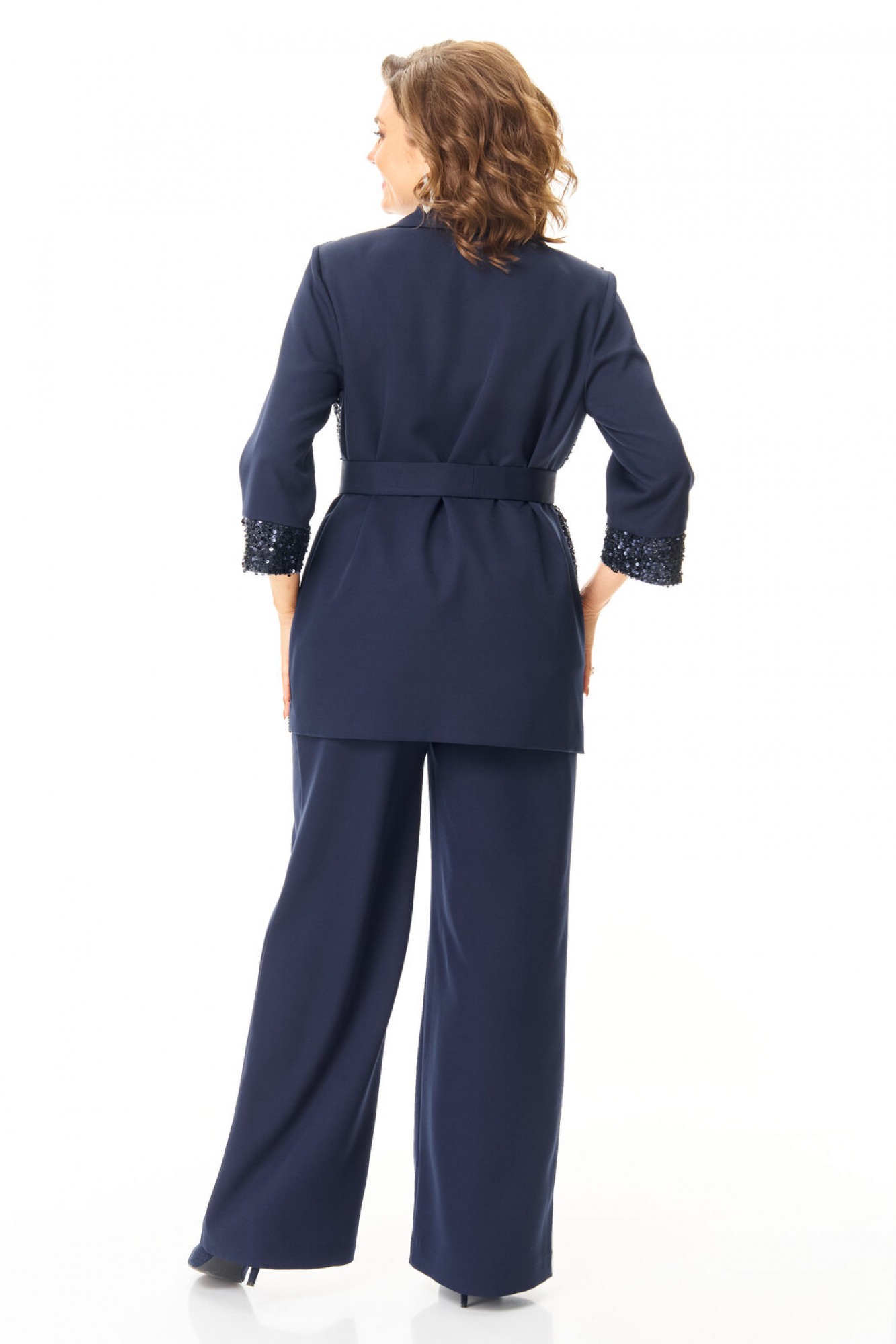 Комплект женский состоит из жакета, топа и брюк. Жакет свободного покроя с естественной линией плеча. Рукав втачной одношовный длиной 3/4 с манжетой из отделочной ткани "пайетки". Перед выполнен из отделочной ткани "пайетки" на атласной подкладке. Обработаны отрезные планки. Застежка центрально-бортовая на петли пуговицы. Воротник отложной типа "шаль". На переде выполнены накладные карманы. Топ свободного покроя из атласной ткани. Горловина округлой формы. Брюки расширенные к низу типа "палаццо" с центральной застёжкой на молнию и петлю-пуговицу. В боковых швах карманы с отрезным бочком. Пояс притачной с резинкой по задней части пояса. В комплект входит съёмный пояс.