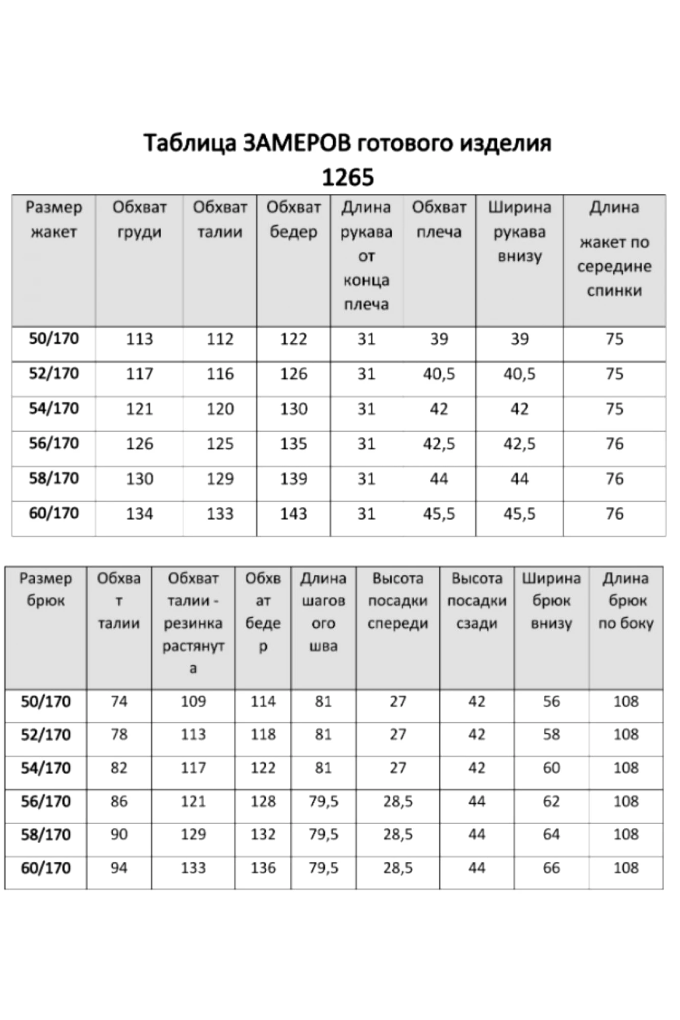 Таблица размеров