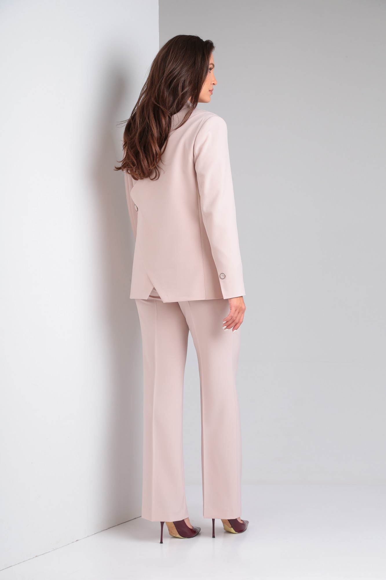 Костюм женский полуприлегающего силуэта, состоит из жакета на подкладке и брюк. Жакет с центральной застёжкой на 1 петлю и 1 пуговицу, с воротником пиджачного типа. Перед с рельефными швами от пройм до низа, с нагрудными вытачками и карманами в рельефных швах. Спинка с рельефными швами от пройм до низа, с отлётной деталью и углом по низу. Рукав втачной, двухшовный, длинный со шлицей в локтевом шве. Брюки прямые от бедра, с застёжкой на тесьму "молнию" в средних срезах передних половинок, гульфик, откосок, с карманами наклонными к боковым швам, с притачным поясом на резинке по задним половинкам, с 1 петлей и 1 пуговицей. По передним и задним половинкам заутюженные канты.
