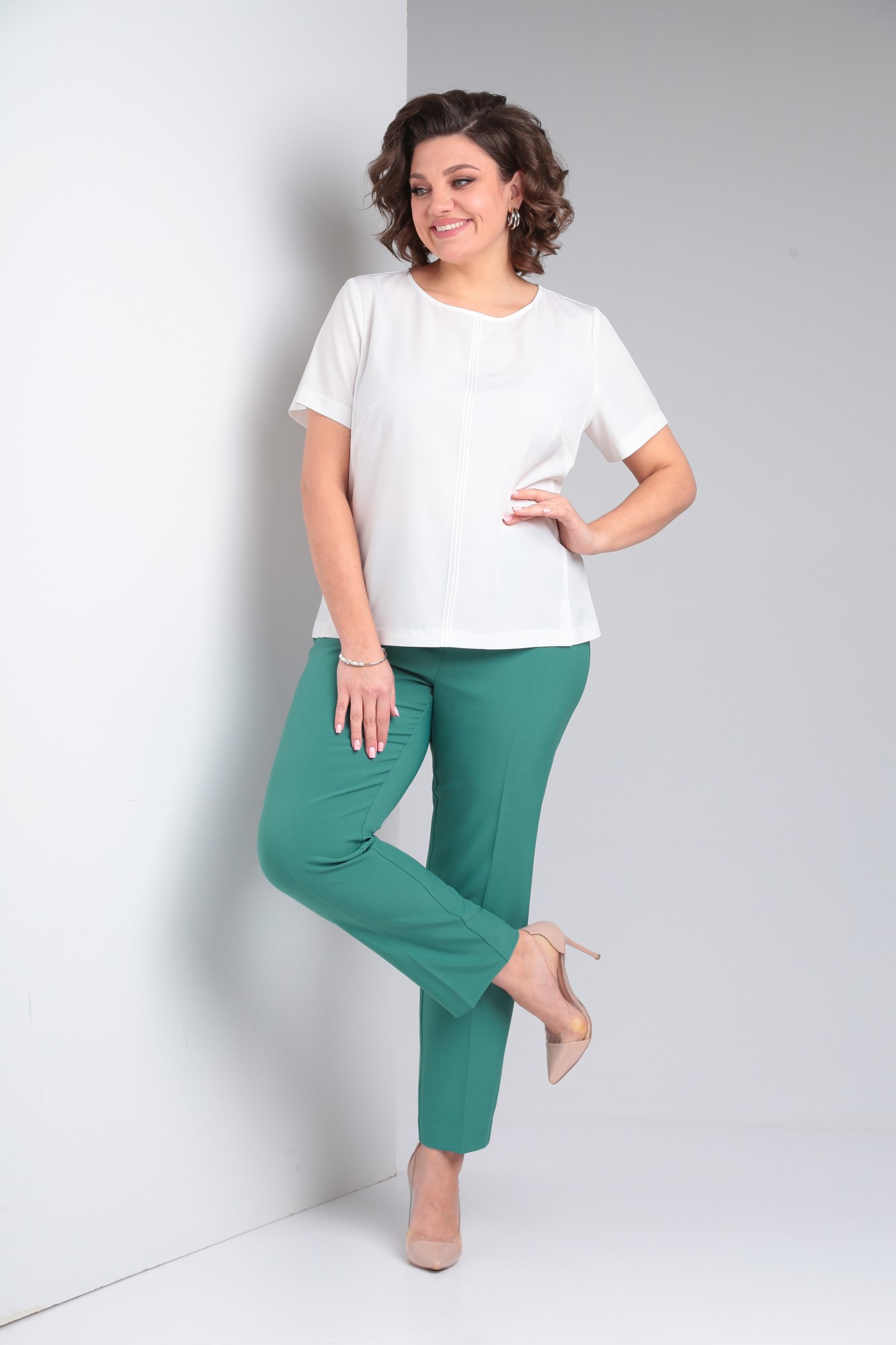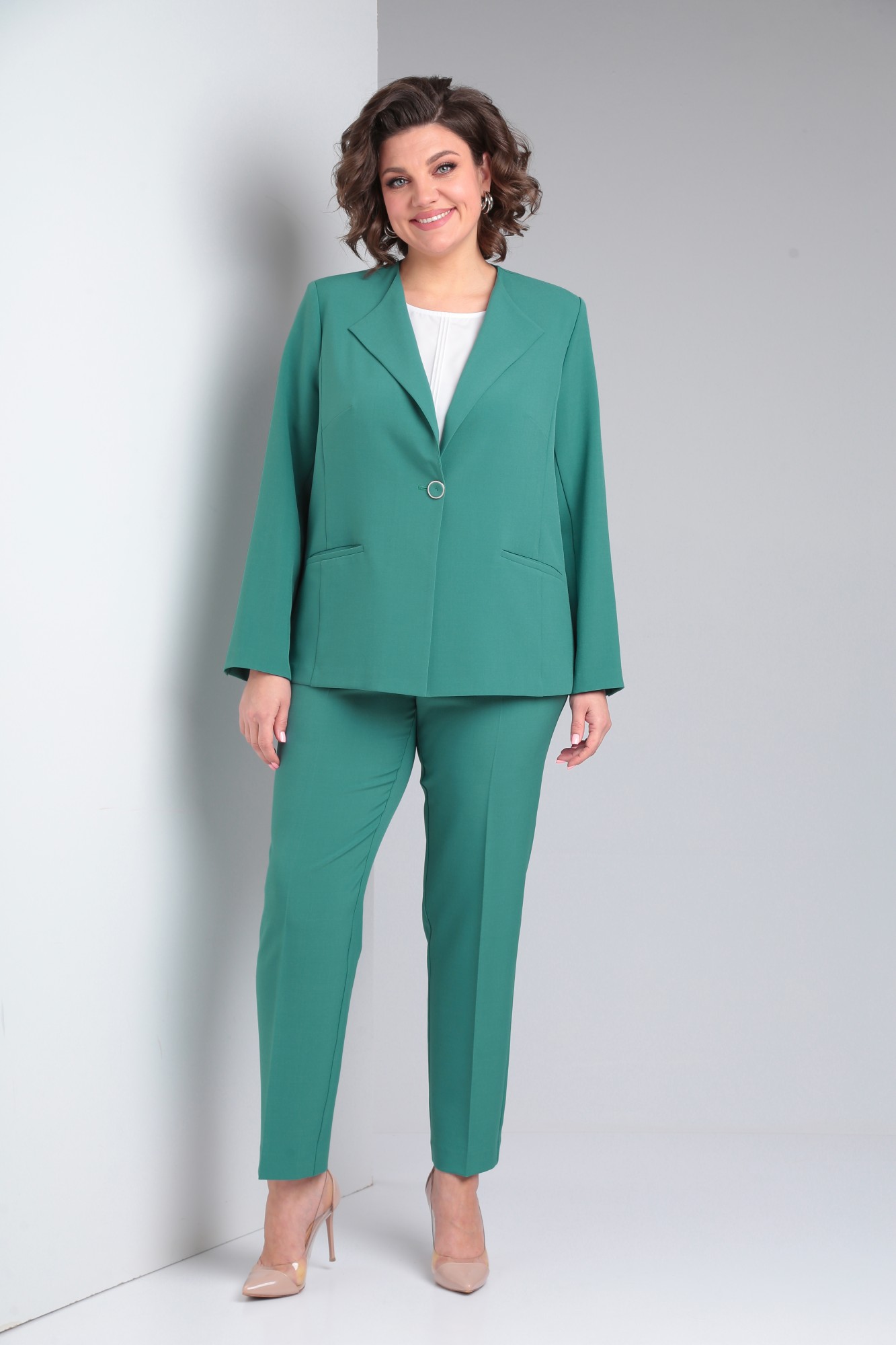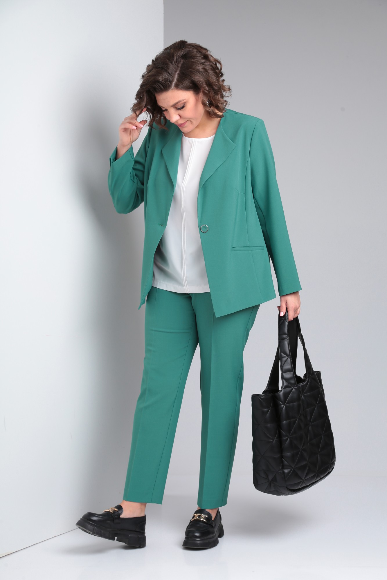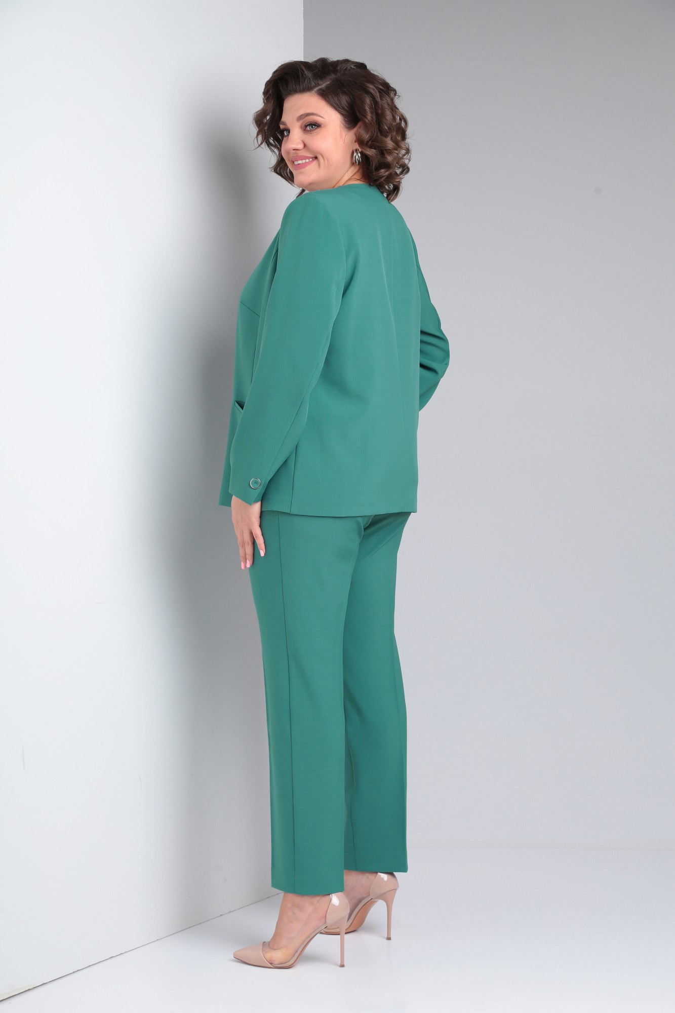 Костюм женский трёхпредметный, состоящий из жакета, брюк и блузы. Жакет полуприлегающего силуэта без подкладки с центральной бортовой застёжкой на 1 петлю-пуговицу до линии перегиба лацкана. Детали переда с отрезными бочками, нагрудными вытачками, выходящими из бочка и прорезными карманами с листочкой. Спинка со средним швом. Рукава втачные двухшовные. Локтевые швы заканчиваются открытыми шлицами с 1 пуговицей. Брюки слегка зауженные к низу с притачным поясом на резинке по задним половинкам. Застёжка на тесьму - молнию в средних срезах передних половинок и 1 петлю-пуговицу на поясе. Блузка полуприлегающего силуэта со слегка спущенной линией проймы. Перед с нагрудными вытачками, выходящими из боковых швов и тремя защипами по 0,1 см. по центру изделия. Горловина овальной формы. Низ изделия фигурной формы.