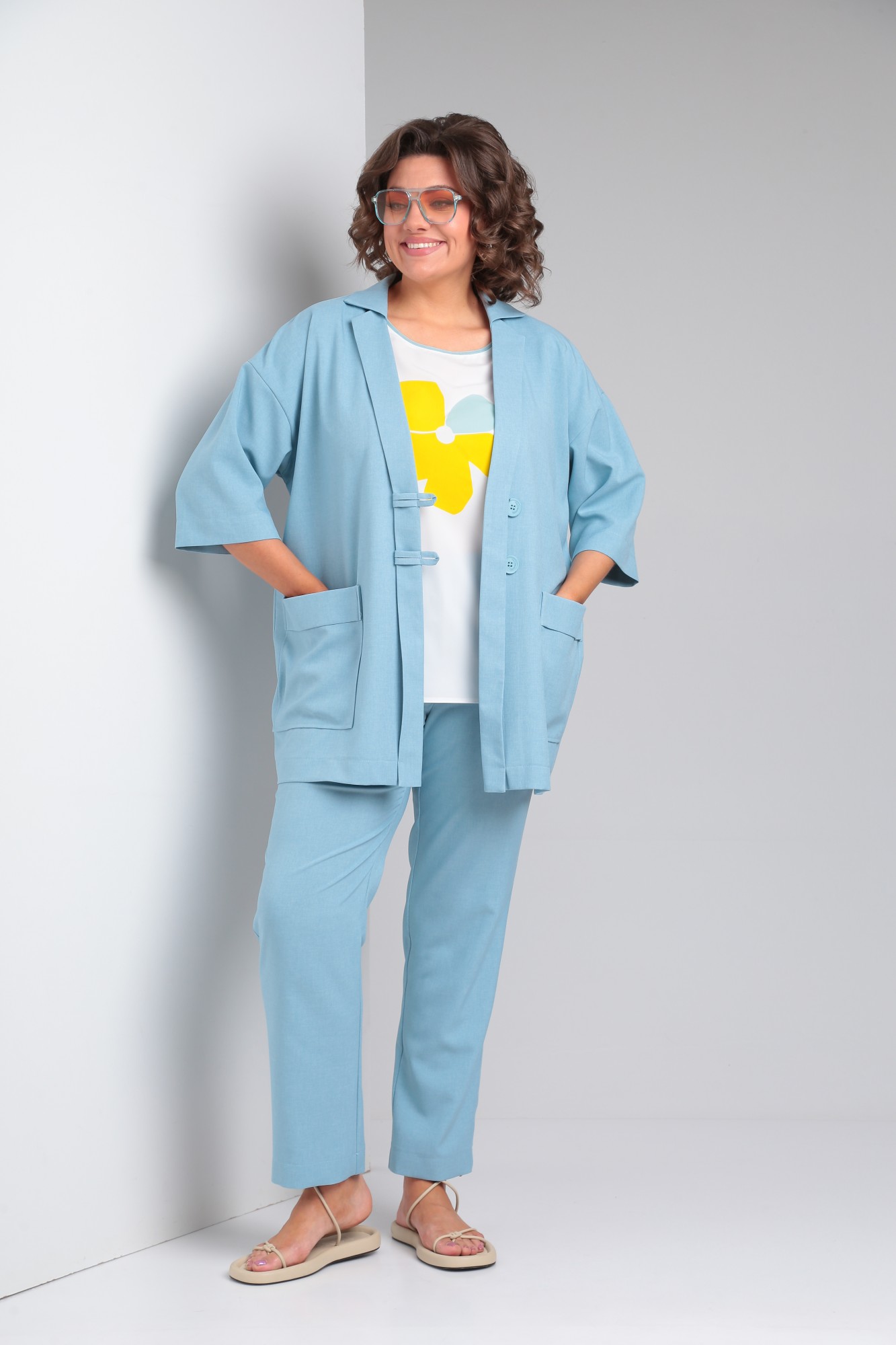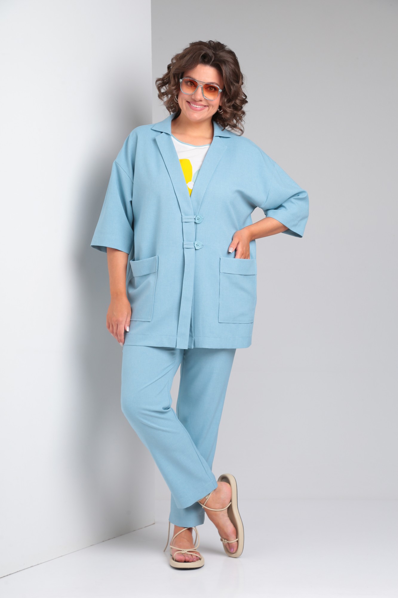 Жакет, брюки: Лён - 58% Полиэстер - 39% Спандекс -3%. Блузка: Полиэстер - 100%