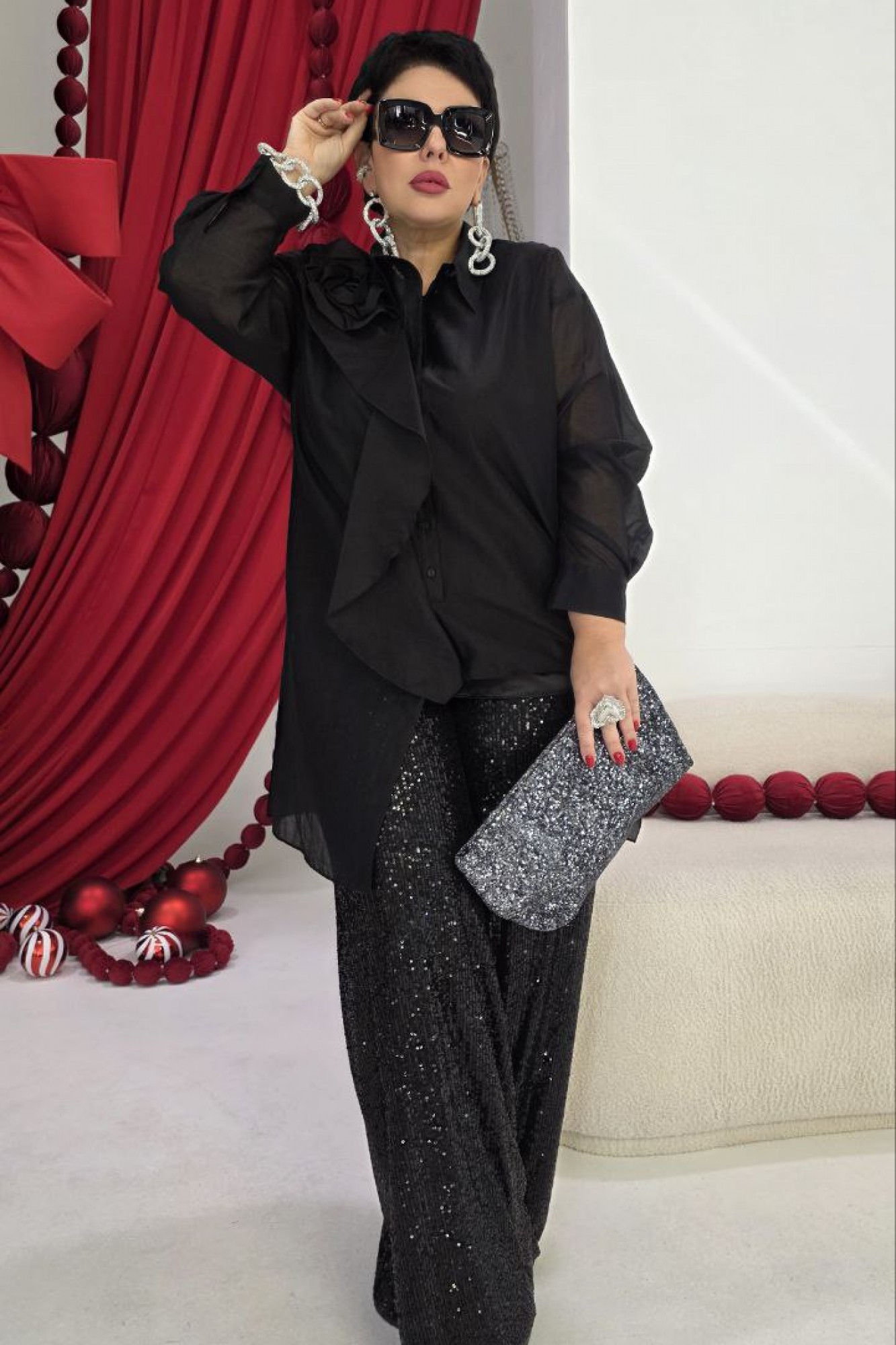Комплект женский боючный, состоящий из блузки, блузы и брюк. Это нарядный и стильный комплект, который идеально подходит для вечернего мероприятия. Брюки выполнены из плотной ткани, полностью расшитой чёрными пайетками, которые создают эффект яркого мерцания при движении. Их свободный крой и высокая посадка на талии обеспечивают комфорт и создают современный, элегантный силуэт. Блузка из полупрозрачной чёрной вуали имеет свободный, струящийся крой. Её главным акцентом является крупный объёмный цветок, расположенный на плече, и декоративная драпировка. Под блузкой надет топ чёрного цвета, который скрывает тело и придаёт образу завершённость. Блузка свободного силуэта, с центральной застёжкой на петли-пуговицы по планке, воротником рубашечного типа. Линия плеча в блузке спущенная. Рукав втачной, длинный с заложенной складкой по низу и притачной манжетой, застёгивающейся на петли-пуговицы. Спинка с отрезной кокеткой. Низа в блузке ассиметричный, в боковом шве высокий разрез. Главным акцентом является декоративный элемент в виде розы. Блуза прямого силуэта с округлой формой горловины и нагрудными вытачками по полочке. В боковых швах разрезы. Брюки прямого силуэта, пояс цельнокроенный, на эластичной тесьме-резинке. Брюки на подкладке.