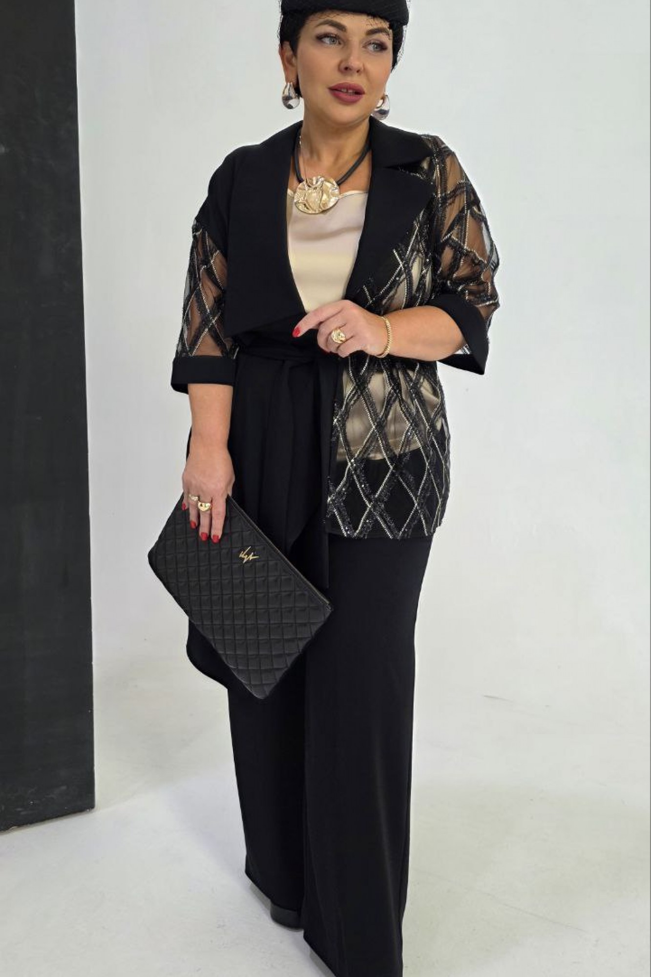 Комплект женский брючный, состоящий из жакета, блузы и брюк. Если Вы ищете идеальное сочетание стиля и комфорта, вот идеальный выбор. Мы специально подобрали качественную и тактильно приятную ткань, которая хорошо держит свою форму, создавая ощущение легкости и свободы движения. Оригинальный асимметричный крой, помноженный на пластические свойства ткани подчеркнет все, что нужно подчеркнуть, и скроет все, что нужно скрыть. Жакет свободного силуэта, ассиметричного кроя создан на контрастах глубокого черного цвета и полупрозрачной отделочной ткани. Жакет на запах, с ассиметричным воротником пиджачного типа и ассиметричным низом. Линия плеча спущенная, рукав втачной, длиной ¾ из полупрозрачной отделочной ткани с притачной манжетой по низу. Спинка в жакете со средним швом. В комплекте идёт пояс. Блуза прямого силуэта с округлой формой горловины и нагрудными вытачками по полочке. Спинка без особенностей. Низ в блузе фигурной формы. Брюки прямого силуэта, длинные. Пояс в брюках притачной на эластичной тесьме-резинке. По переду брюк прорезные карманы.