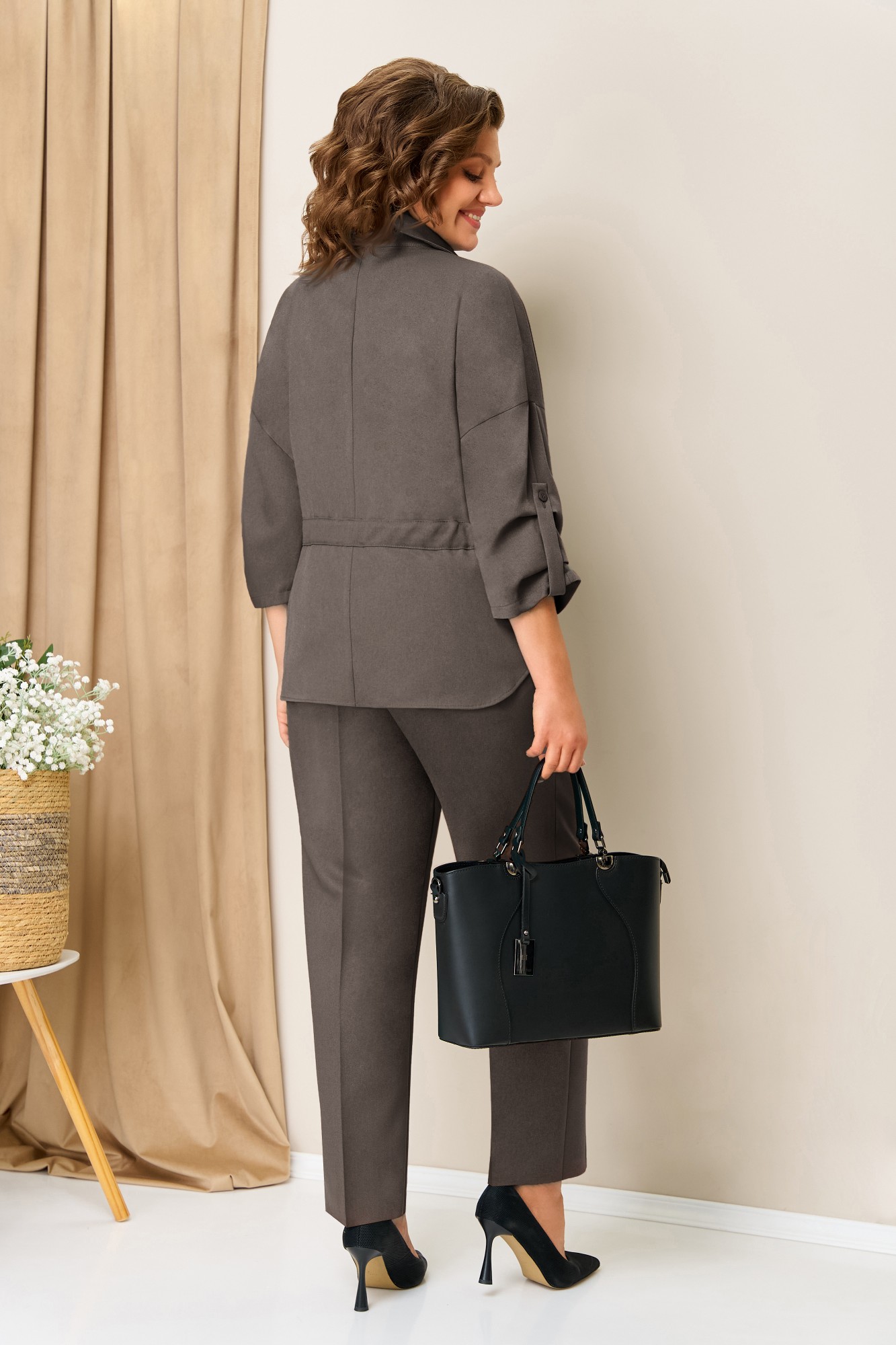 Жакет на потайной застежке, с пришивной кулисой и поясом, прямые классические брюки и блуза- универсальный комплект для различных вариантов носки. Элегантный рукав с патой на цельнокроеной основе. Брюки прямые с высокой посадкой, с притачным поясом на резинке. Блуза из легкого текстиля с принтом, со спущенным коротким рукавом.