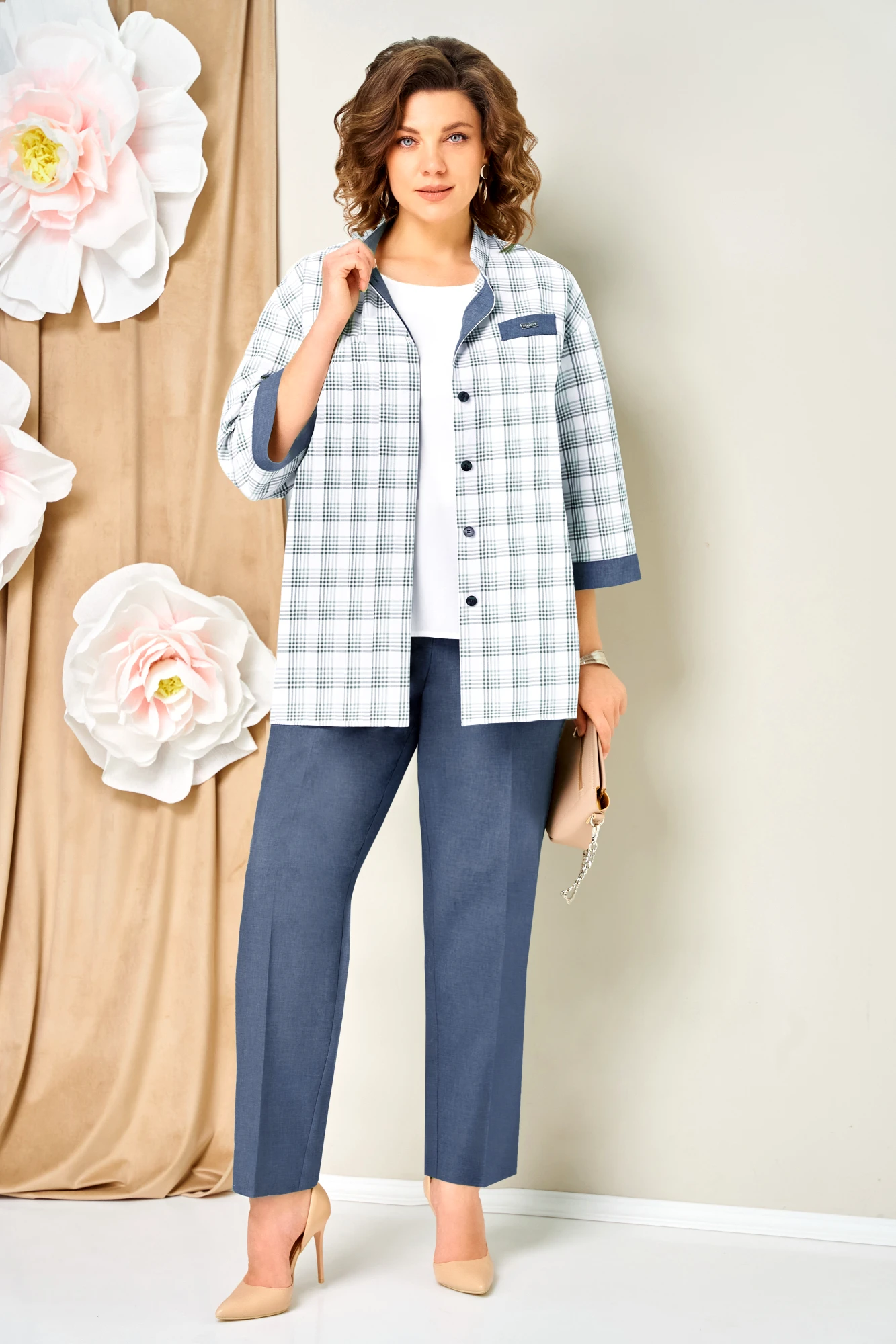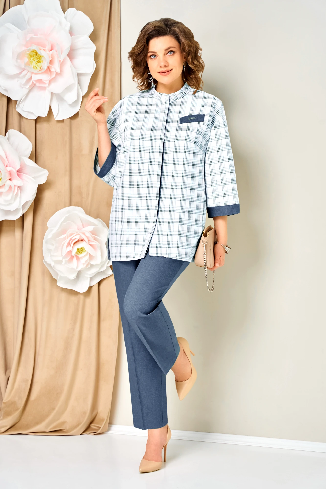 Брючный костюм Volna 1465 тройка голубой джинсовый