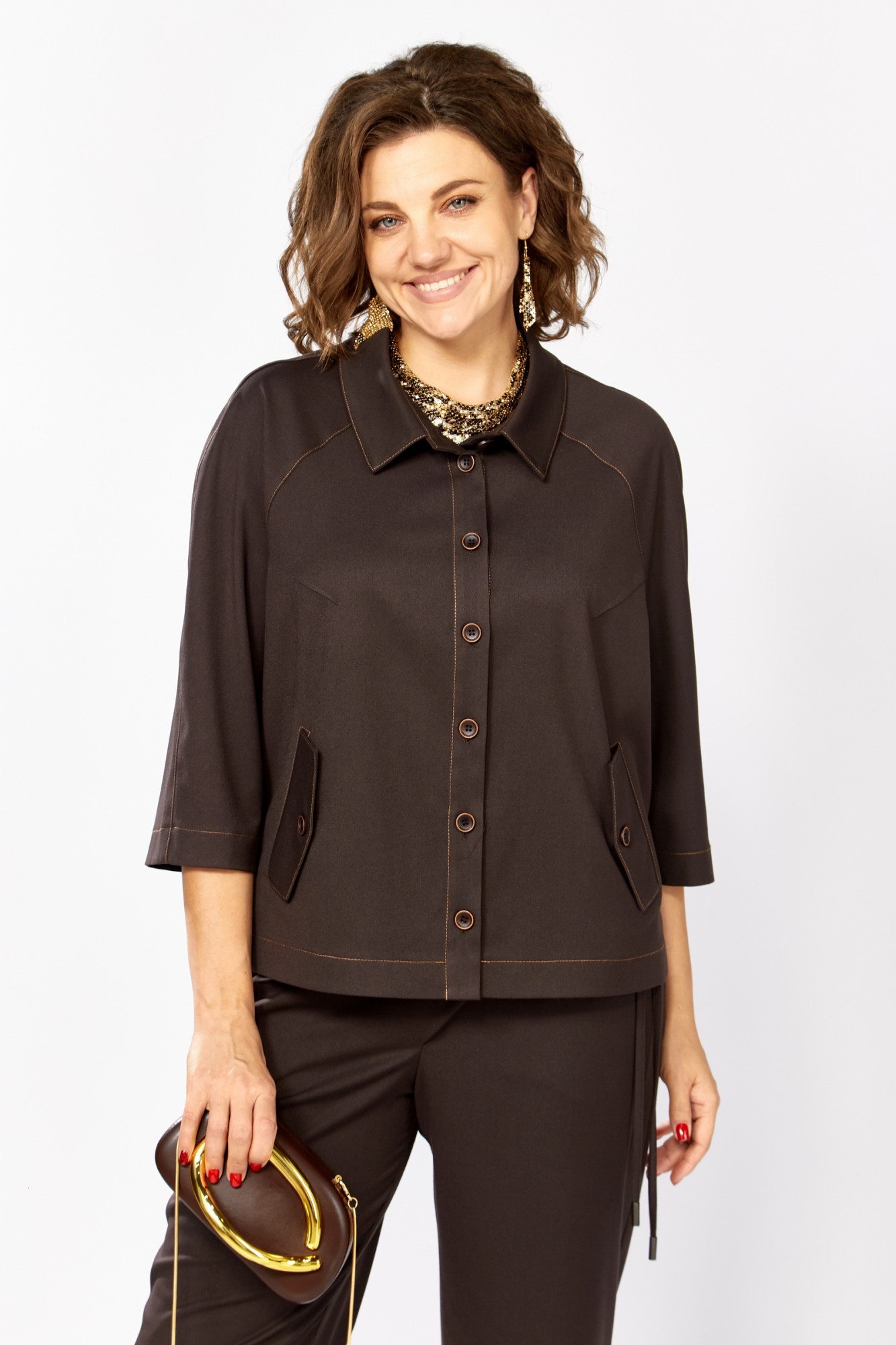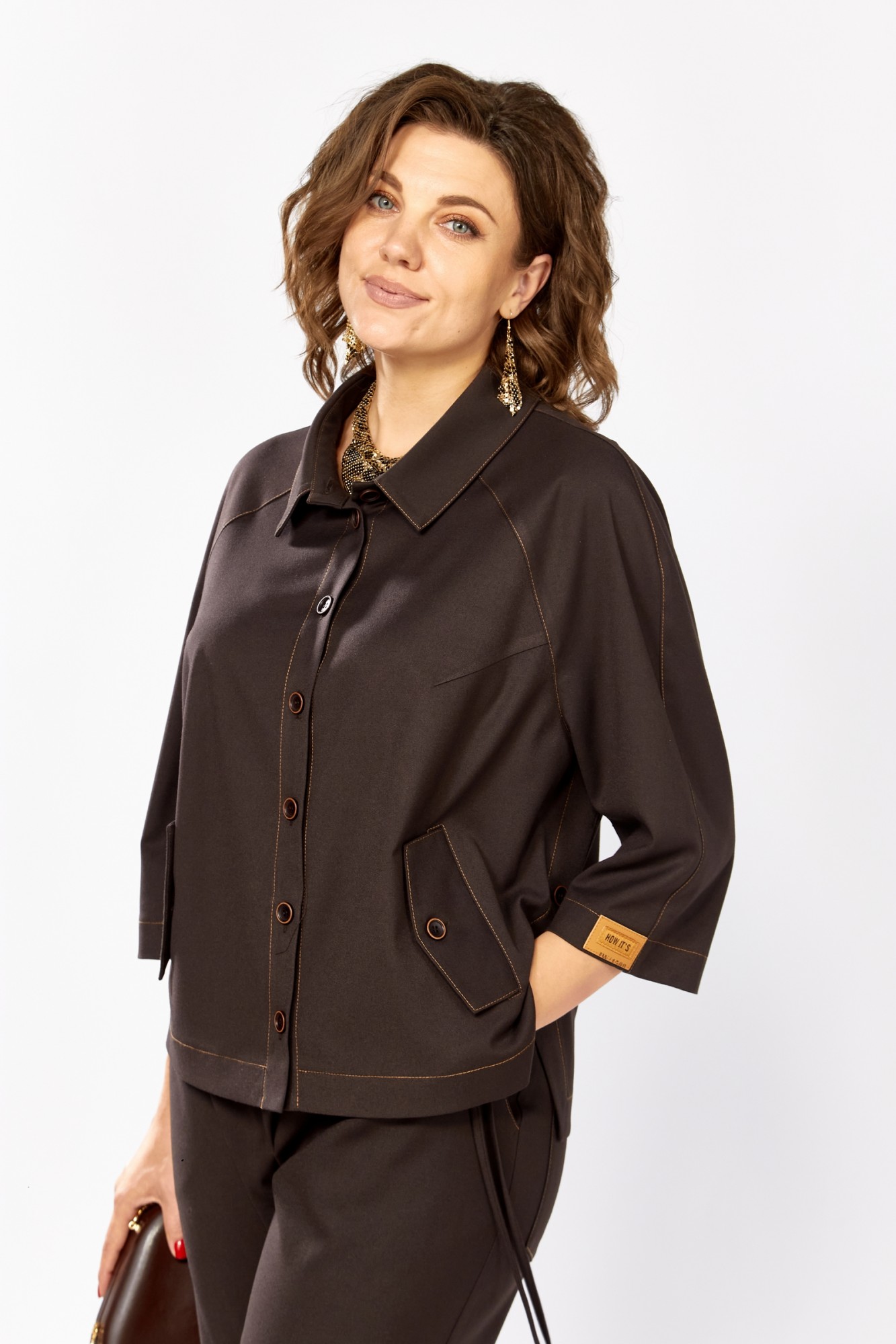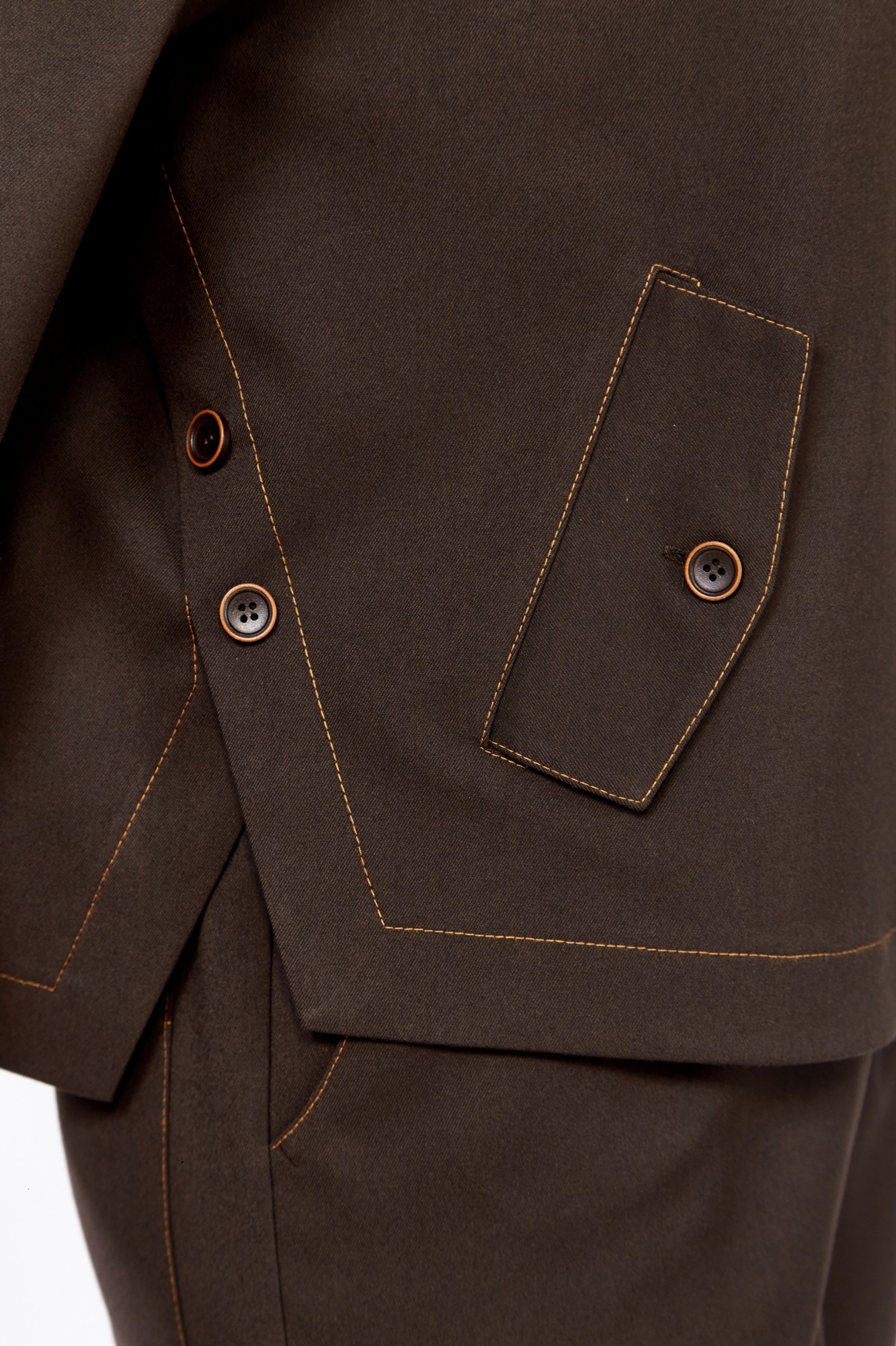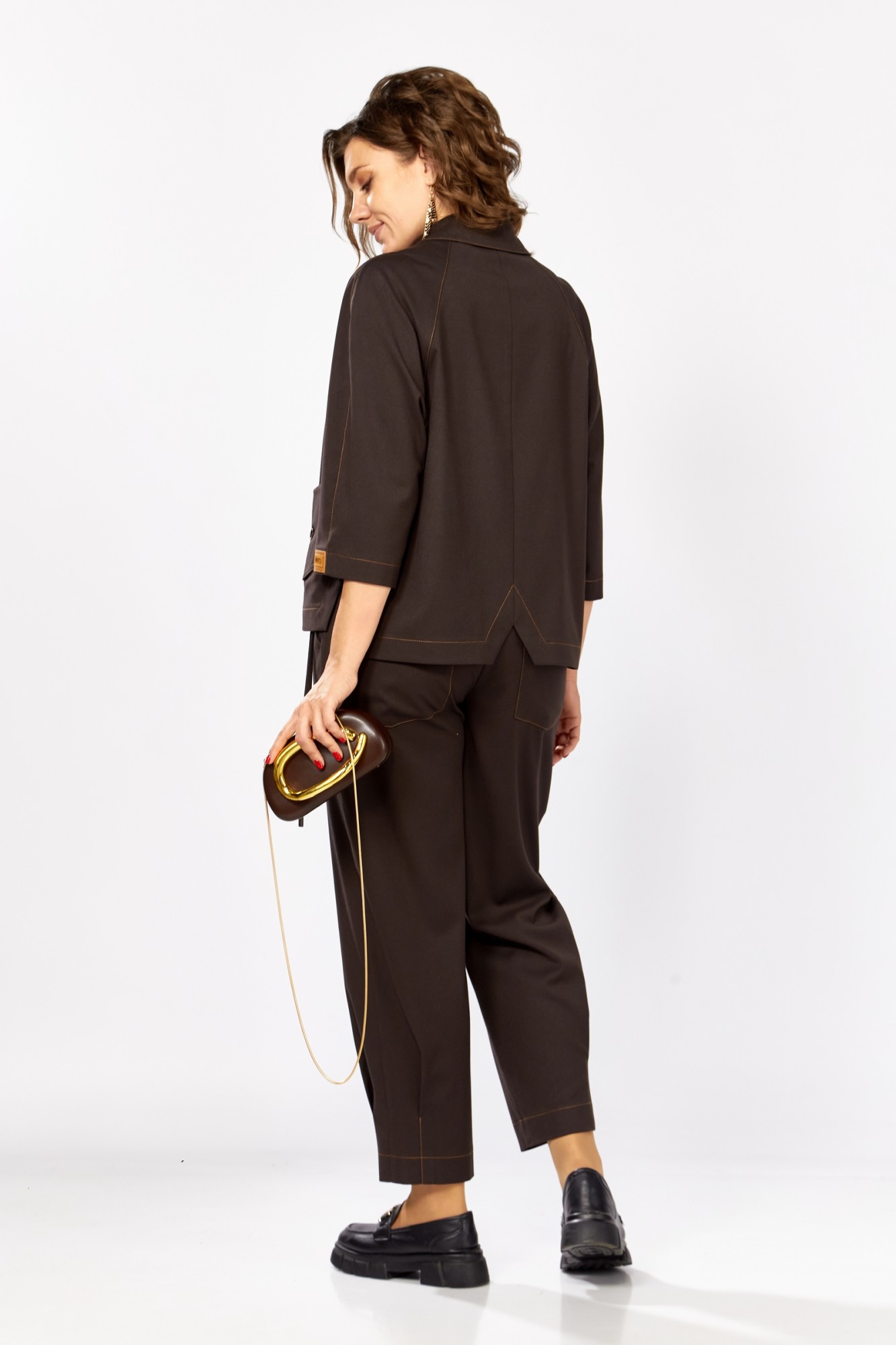 Стильный костюм выполнен из поливискозной костюмной ткани цвета горького шоколада и отстрочен контрастной отделочной строчкой. Свободный крой подарит уверенность и комфорт, а сбалансированные пропорции выгодно подчеркнут вашу фигуру. Жакет прямого силуэта, воротник рубашечный, рукав реглан, спинка со средним швом. Низ спинки фигурной формы, на полочках обработаны карманы с клапаном. В боковых швах жакета обработаны шлицы, которые декорированы пуговицами. Застежка центральная, на петли пуговицы. Брюки прямые, зауженные к низу за счет складок, которые отстрочены контрастной отделочной строчкой. Перед брюк с карманами. Застежка на тесьму-молнию, которая закрыта ассиметричной складкой с завязкой. Задние половинки брюк с накладными карманами. Пояс брюк цельнокроеный, сзади на резинке. Завязки декорированы металлическими наконечниками. Костюм декорирован нашивками, расположенными по низу брюк и низу рукава.