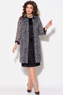 Платье полуприлегающего силуэта, к низу чуть зауженное, на подкладке из дышащей, приятной на ощупь и достаточно эластичной ткани. Длина 107,0 см. по среднему шву спинки. Рельефы переда выходят из плечевого шва, проходят через центр груди вниз. Средняя часть отрезная по линии талии. На верхней части декоративные швы в виде ромбов, украшенные стеклярусом. Спинка с талевыми вытачками, в среднем шве обработана застёжка на потайную тесьму молнию и шлица. Горловина обтачная, углублённая спереди, круглая. Рукава втачные, одношовные, длиной 27,0 см. Изделие с плечевыми накладками. Отделка на фото белая.