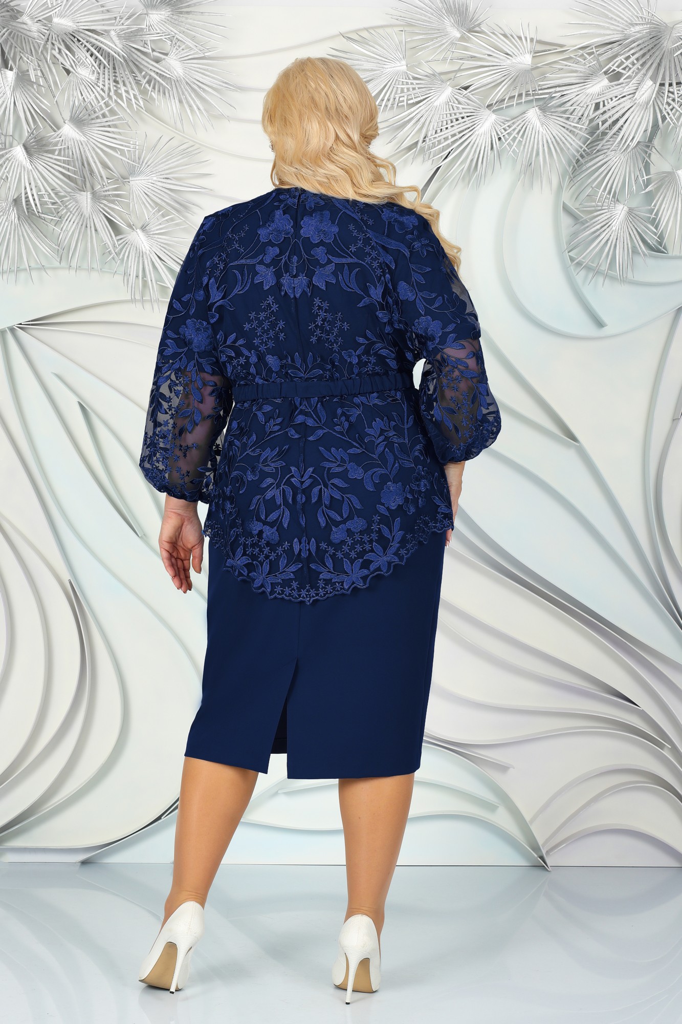 Платье женское полуприлегающего силуэта, длиной по среднему шву спинки 111 см, перед и спинка на трикотажной подкладке. Перед платья с отрезными кокетками в которых обработаны по 4 горизонтальных складки и нагрудными вытачками, выходящими из-под кокеток. Спинка с талиевыми вытачками и средним швом, в котором в верхней части расположена застежка на потайную тесьму-"молнию", в нижней части- шлица. Горловина переда углубленная, трапецивидной формы, горловина спинки округлой формы. Рукав втачной, одношовный, длиной 28 см. В верхнем шве рукава обработаны разрезы. Платье с плечевыми накладками, с декоративным съемным поясом шириной 3 см, с застежкой на 1 петлю и 1 пуговицу, в пояс частично вставлена резинка.