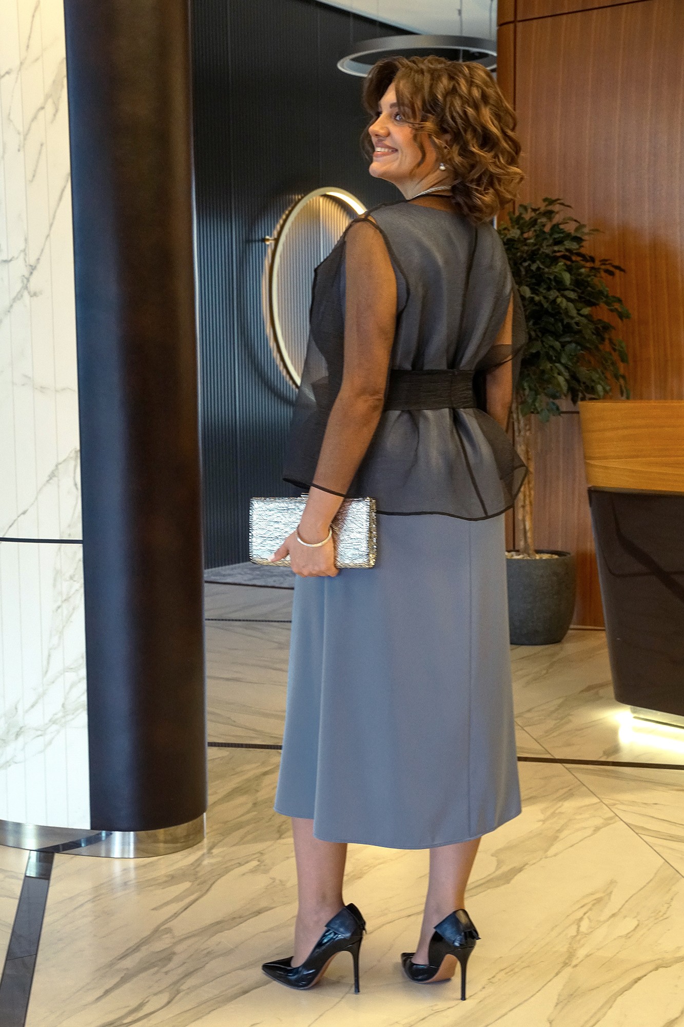 Платье полуприлегающего силуэта вверху книзу типа «рыбки», раскроено по косой. Перед с нагрудными выточками.