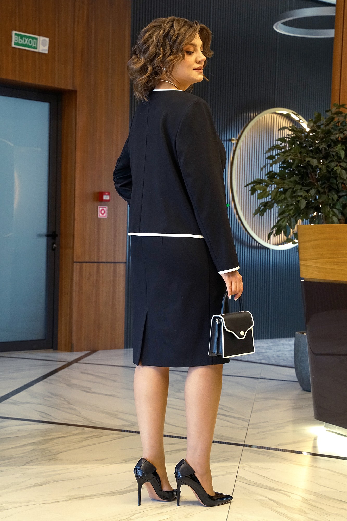 Платье полуприлегающего силуэта, с застёжкой на потайную молнию в среднем шве спинки. Перед с нагрудными и талевыми выточками. Спинка с талевыми выточками и шлицей.