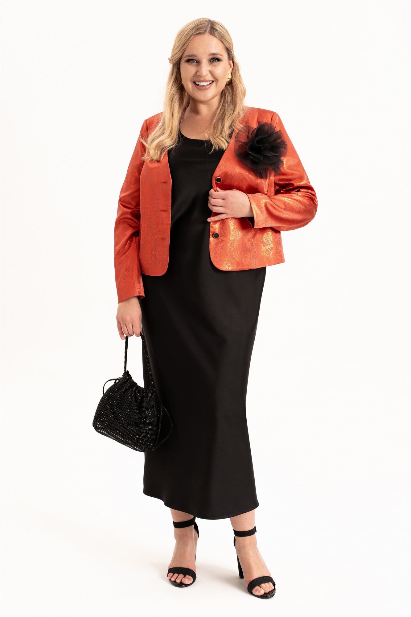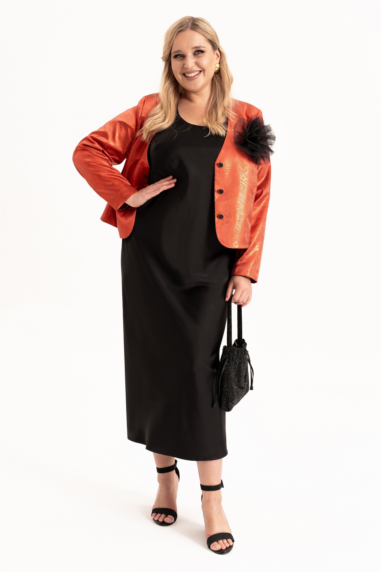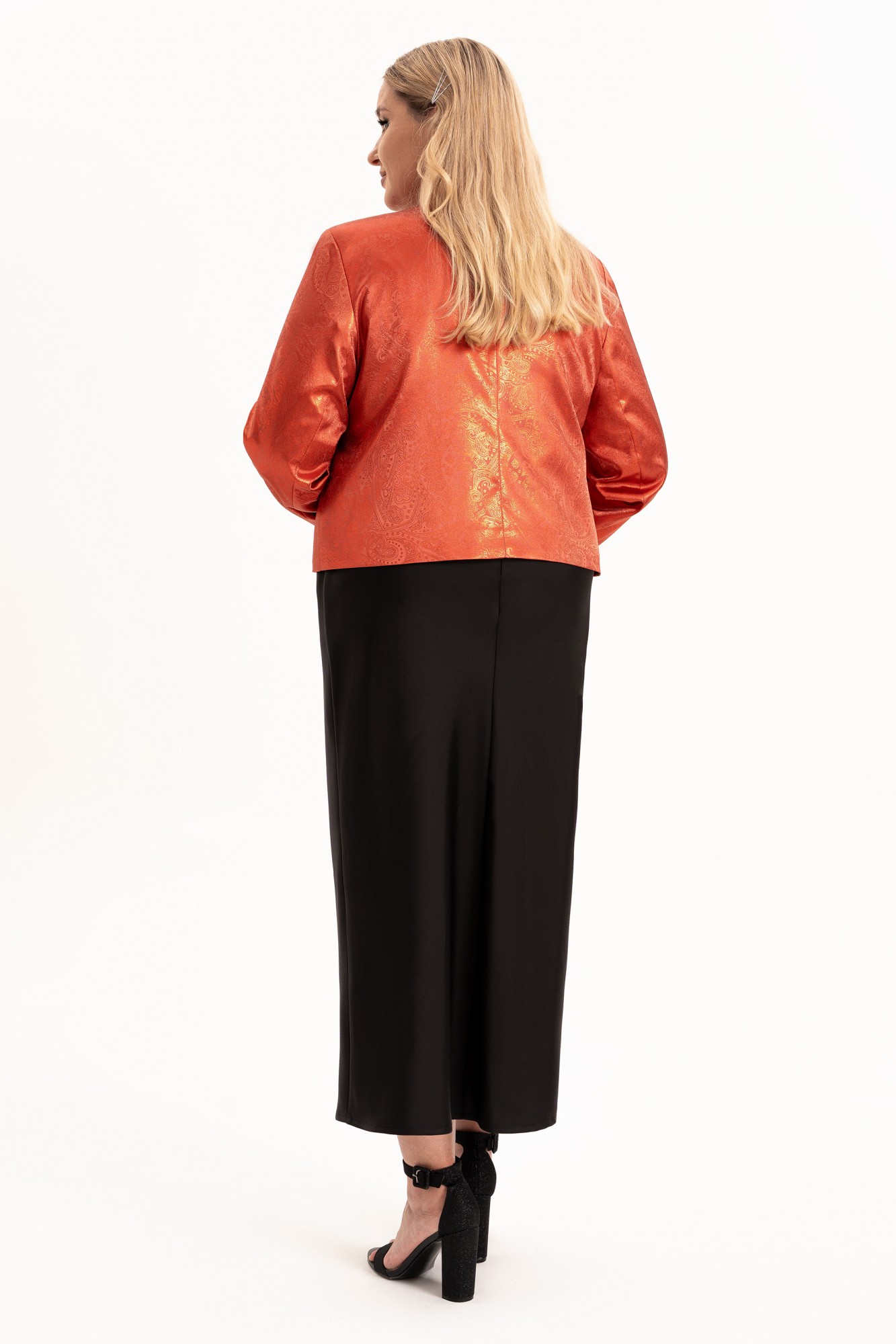 Элегантный женский комплект «двойка» больших размеров — идеальный выбор для женщин с пышными формами, который сочетает в себе комфорт, стиль и изящество. Модель состоит из двух элементов: лаконичного платья из струящегося атласа, кроеного по косой и короткого жакета, полуприлегающего силуэта на подкладке. Такой тандем создает утонченный и женственный образ, который прекрасно подойдет как для вечерних выходов, торжеств, так и для повседневного ношения или работы в офисе. Жакет полуприлегающего силуэта, с центральной застёжкой на петли и пуговицы и с рельефами от плеча по переду, закругленный низ борта. Спинка в жакете со средним швом . Рукав втачной, двухшовный, длинный. Платье кроенное по косой, что обеспечивает красивую посадку и мягкое облегание по фигуре. Углубленная горловина добавляет лёгкой чувственности, а нагрудные вытачки от проймы подчёркивают линию груди. В комплекте идет съемный цветок- брошь.