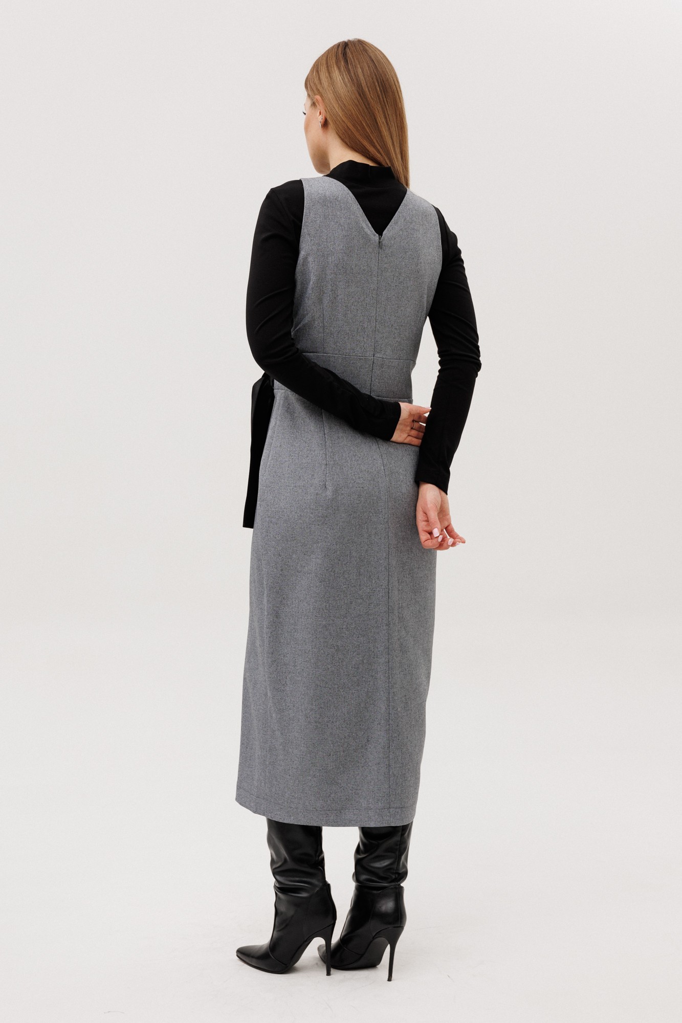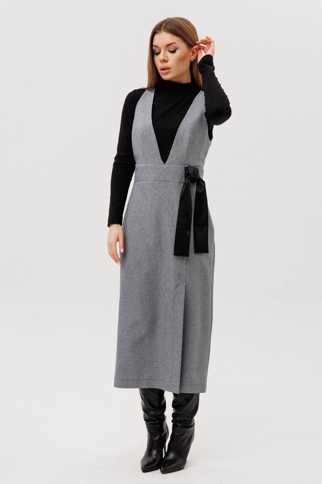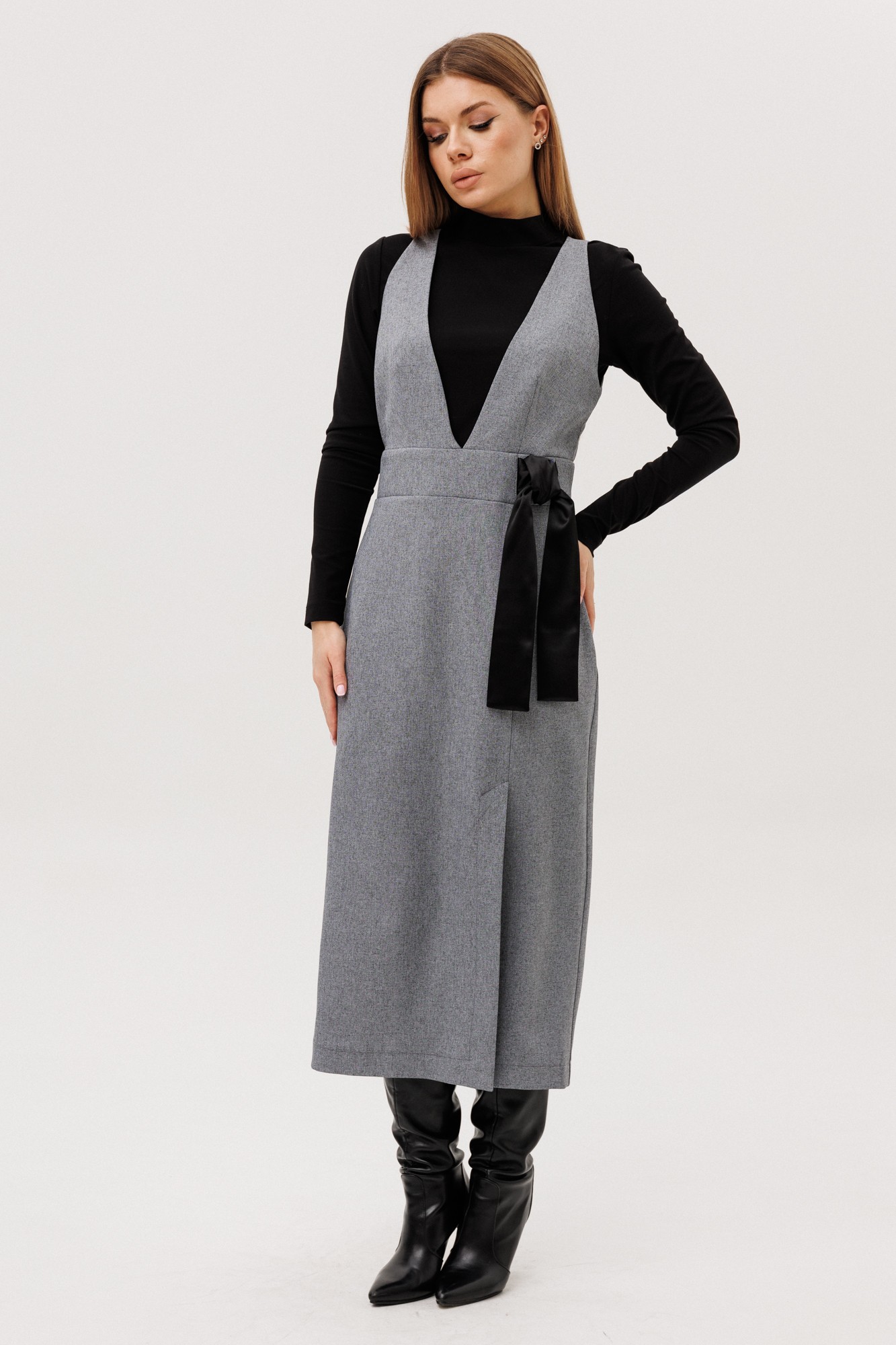 Костюм двухпредметный: Сарафан женский прилегающего силуэта с V-образным вырезом, вытачками на лифе. На притачном поясе декоративный элемент - бант из атласной черной ткани. По переду разрез. На спинке сарафана молния. Длина миди. Изделие на подкладке. Джемпер женский прилегающего силуэта с втачным одношовным рукавом с воротником-стойкой.