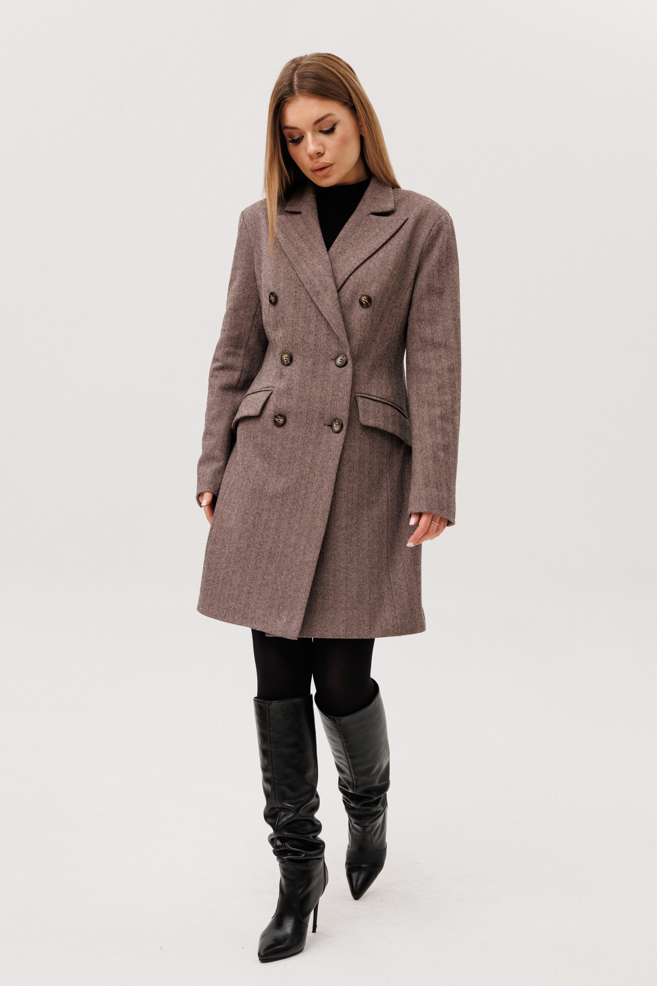 Платье-пиджак прилегающего силуэта, выполнен из теплой ткани. Застежка на петли-пуговицы, по переду действующие карманы, на рукавах шлицы. Изделие на подкладке. Джемпер женский прилегающего силуэта с втачным одношовным рукавом с воротником-стойкой.