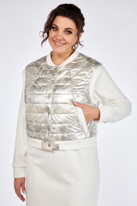 Жилет прямого силуэта укороченный,выполнен из плащевой ткани простеганной тонким синтепоном.По переду рельефы от горловины до низа,в швах карманы,вход в карманы обработан листочкой.Застежка центральная на 6 кнопок. Спинка с рельефами. Горловина,проймы,пояс и листочки жилета выполнены из трикотажного полотна футер "трёхнитка".Жилет на подкладке в дизайн.