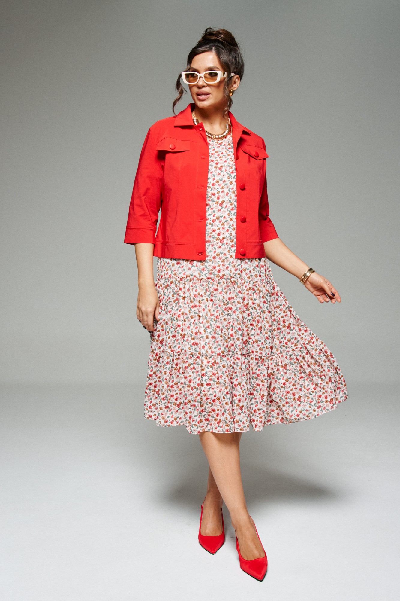 Комплект женский 2-ух предметный: жакет-куртка и платье. Женский лёгкий стильный жакет (аналог джинсовой куртки) идеален в сочетании с романтическим шифоновым платьем. Изделие будет радовать долго, так как ткань проста в уходе и держит форму на протяжении длительного периода времени. Жакет в стиле «кантри», без подкладки, полуприлегающего силуэта. Передняя часть с отрезной кокеткой и вертикальными рельефными подрезами. В верхней части полочки присутствуют декоративный элементы в виде клапанов. Спинка с кокеткой в верхней части и двумя вертикальными рельефами от нее. Рукав чуть ниже локтя одношовный втачной с притачной манжетой внизу. Застежка центральная на прорезные петли и пуговицы на притачной планке. Воротник стояче-отложной, рубашечного типа. Платье выполнено из легкой, струящейся ткани, на трикотажной подкладке. Прямой, свободный силуэт. Передняя, верхняя часть цельнокроеная, с двумя нагрудными вытачками. Спинка цельная, без вытачек. Платье отрезное по линии бедер. По нижней части платья располагаются два притачных волана, шириной ок.25см. Горловина округлой формы. Рукав втачной одношовный короткий. По низу рукава сборка на тонкую резинку. С учётом плюсовых прибавок подходит на рост 170 см.