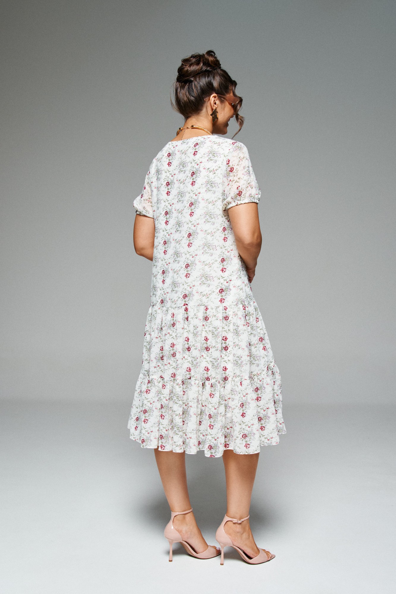 Комплект женский 2-ух предметный: жакет-куртка и платье. Женский лёгкий стильный жакет (аналог джинсовой куртки) идеален в сочетании с романтическим шифоновым платьем. Изделие будет радовать долго, так как ткань проста в уходе и держит форму на протяжении длительного периода времени. Жакет в стиле «кантри», без подкладки, полуприлегающего силуэта. Передняя часть с отрезной кокеткой и вертикальными рельефными подрезами. В верхней части полочки присутствуют декоративный элементы в виде клапанов. Спинка с кокеткой в верхней части и двумя вертикальными рельефами от нее. Рукав чуть ниже локтя одношовный втачной с притачной манжетой внизу. Застежка центральная на прорезные петли и пуговицы на притачной планке. Воротник стояче-отложной, рубашечного типа. Платье выполнено из легкой, струящейся ткани, на трикотажной подкладке. Прямой, свободный силуэт. Передняя, верхняя часть цельнокроеная, с двумя нагрудными вытачками. Спинка цельная, без вытачек. Платье отрезное по линии бедер. По нижней части платья располагаются два притачных волана, шириной ок.25см. Горловина округлой формы. Рукав втачной одношовный короткий. По низу рукава сборка на тонкую резинку. С учётом плюсовых прибавок подходит на рост 170 см.