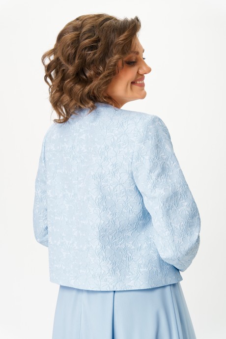 Элегантный женский комплект, состоит из платья и жакета. Платье выполнено из двух видов ткани, жаккарда и шифона. Лиф из жаккардовой ткани, с рельефными и центральным швом, горловины” V “ образная, проймы с крылышками из шифона. Застежка на тесьму молния в центральном шве спинки. Юбка из шифона, со складками по талии. Платье на подкладке. Жакет из жаккарда полуприлегающего силуэта без застежки, рукава втачные. Жакет без подкладки.
