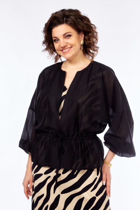 Комплект женский состоит из платья полуприлегающего силуэта и свободной блузы без застежки. Платье с V- образной горловиной и разрезами по боковым швам. Перед с нагрудными вытачками. Блуза выполнена из полупрозрачной ткани. Рукав втачной, одношовный, со спущенной линией плеча, по низу рукав собран на резинку. В области талии обработана кулиса со шнуром.