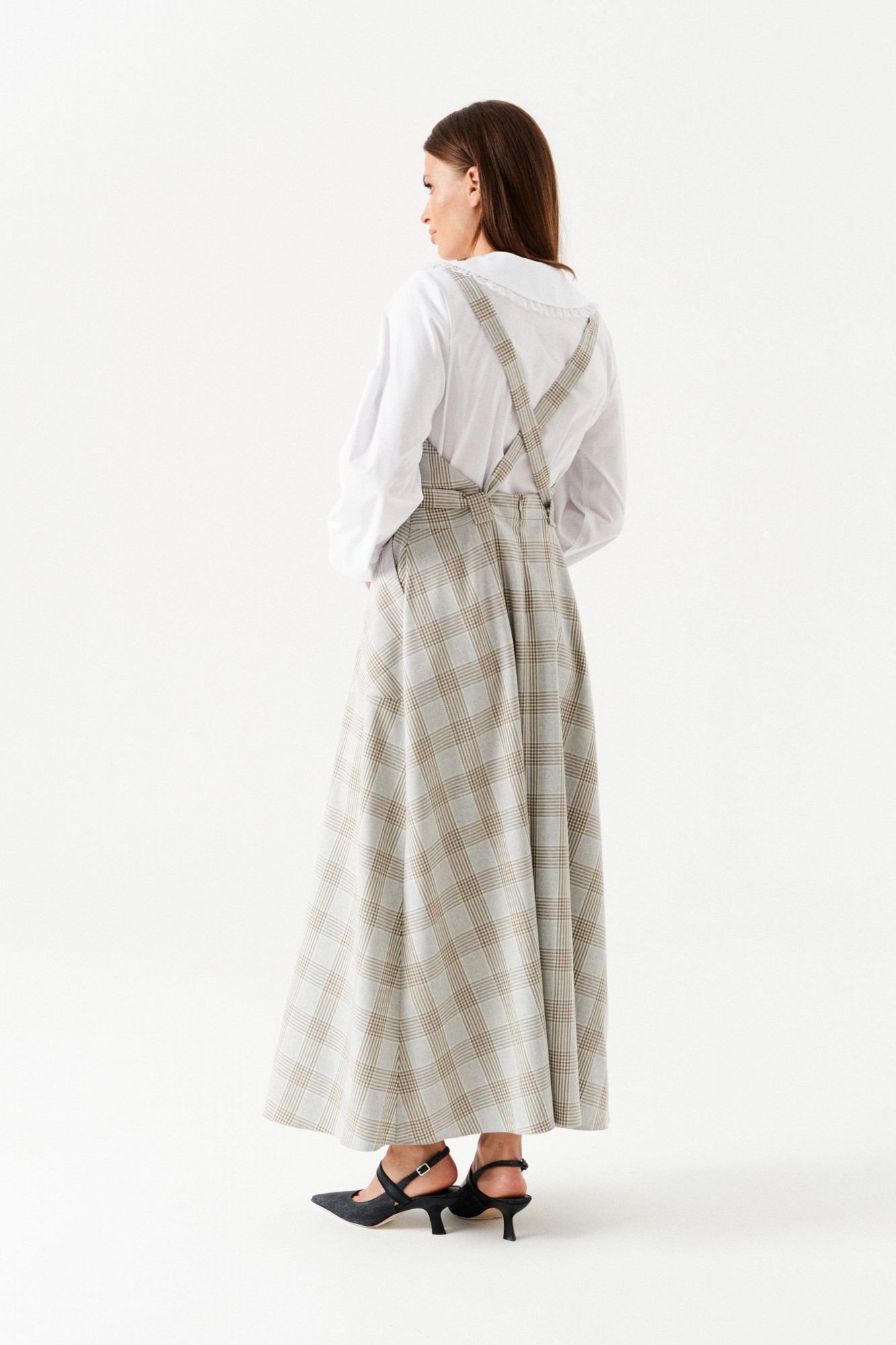 Комплект женский 2-х предметный состоящий из сарафана и блузки. Сарафан с открытой спиной, отрезной, длинный. Нижняя часть сарафана расклешенная. Перед с круглым вырезом горловины, нагрудными вытачками, накладными карманами. На поясе по спинке расположены шлевки для регулировки длины лямок. В среднем шве спинки застежка на потайную молнию. Блузка прямого силуэта из хлопковой ткани, с центральной застежкой на петли и пуговицы. Воротник отложной, округлой формы, по краю оформлен кружевом. Рукав втачной, длинный, по низу присборен на резинку.