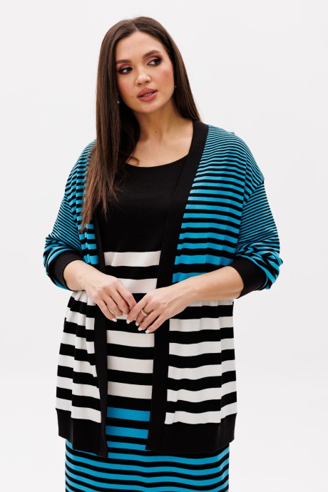 Трикотажный комплект - это модное решение для гардероба в стиле кежуал. Вместо классического тандема с юбкой, выбираем более расслабленный с платьем и кардиганом, плюс оригинальная многоцветная полоска, и не скучный современный ""look"" готов. Платье упрямлённого силуэта, с отрезной кокеткой по полочке и спинке. Кокетка из эластичного кашкорсе. Кардиган свободного силуэта с заниженной линией плеча, рукавом расширенным в области оката. По низу рукава, кардигана и краю борта отделочное кашкорсе.