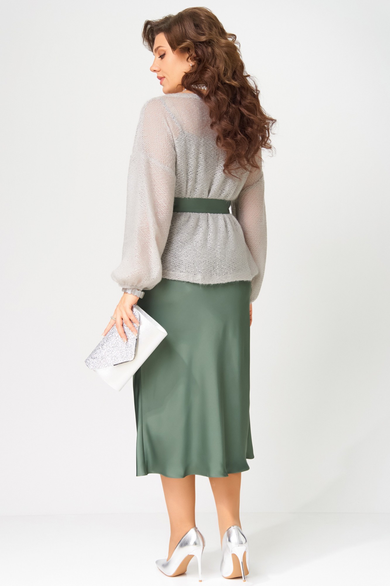 ""Эдита"" — элегантный образ для волшебной ночи. Сатиновое платье струится мягким блеском, а трикотажная накидка из махера с шерстью добавляет тепла и фактурности. Идеальный наряд для встречи Нового года и других торжеств, когда хочется сиять и чувствовать себя особенно.