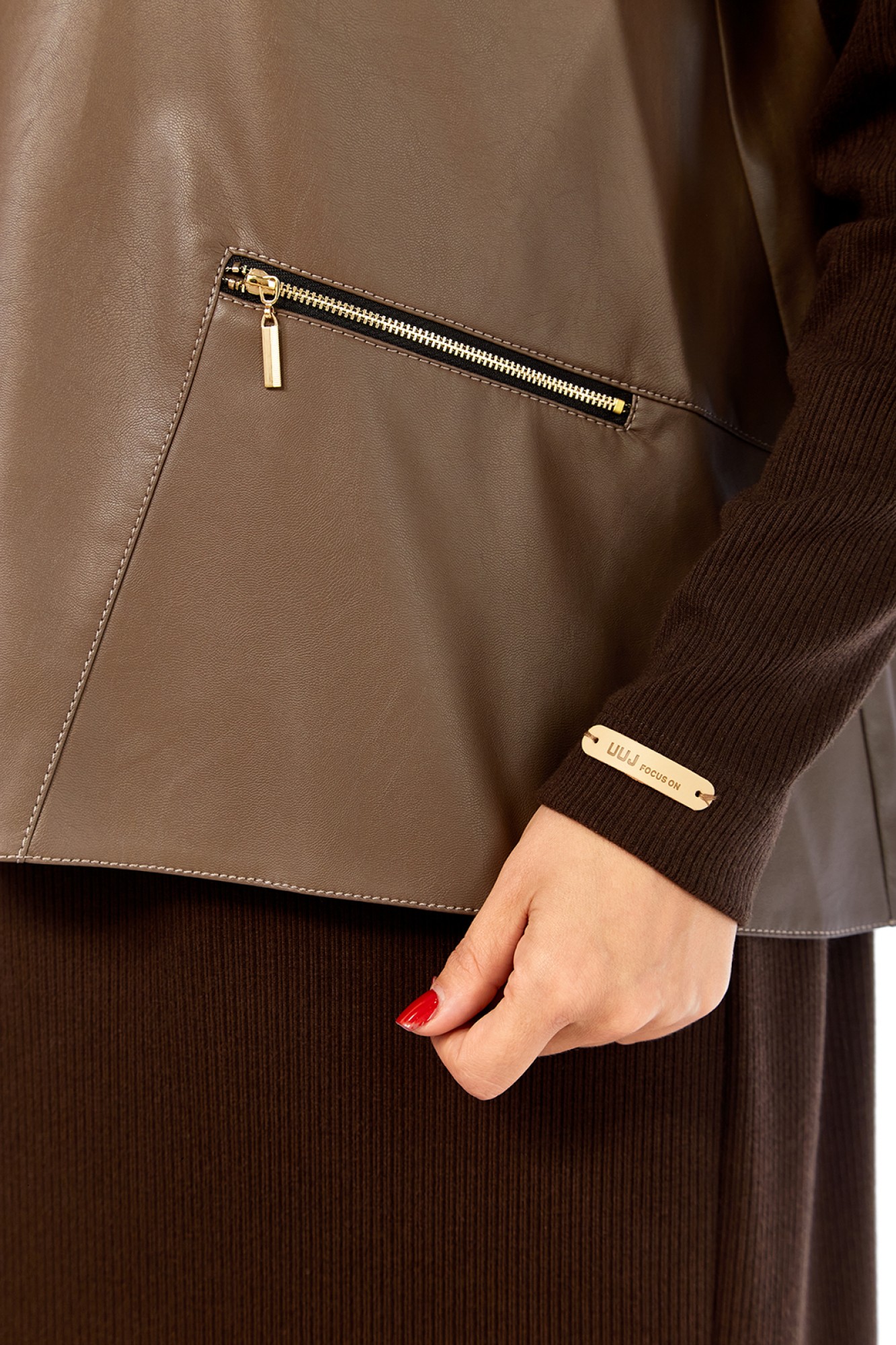 Комплект женский двухпредметный состоит из платья и жилетки. Платье свободного силуэта выполнено из трикотажного полотна ( лапша ). Перед и спинка цельнокроеные. Рукава спущенные. Жилетка выполнена из искусственной кожи на вискозной основе, А — силуэта. Перед со средним швом и асимметричным декоративным элементом. Спинка разрезная по центру.