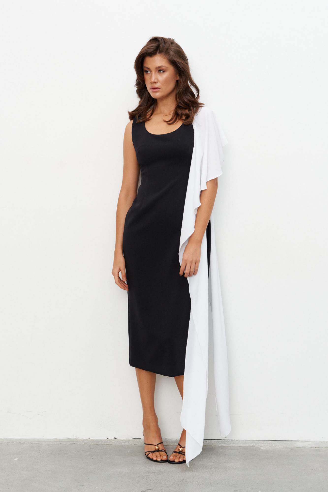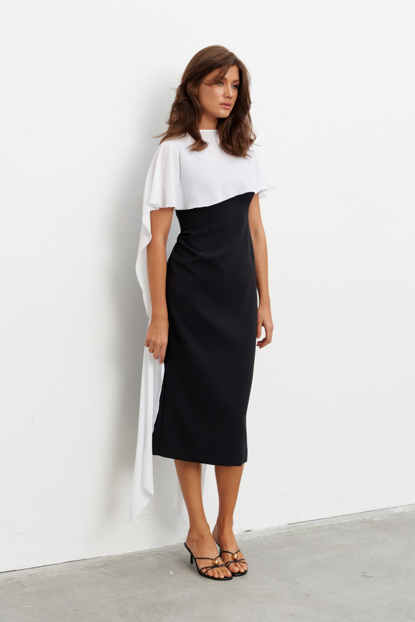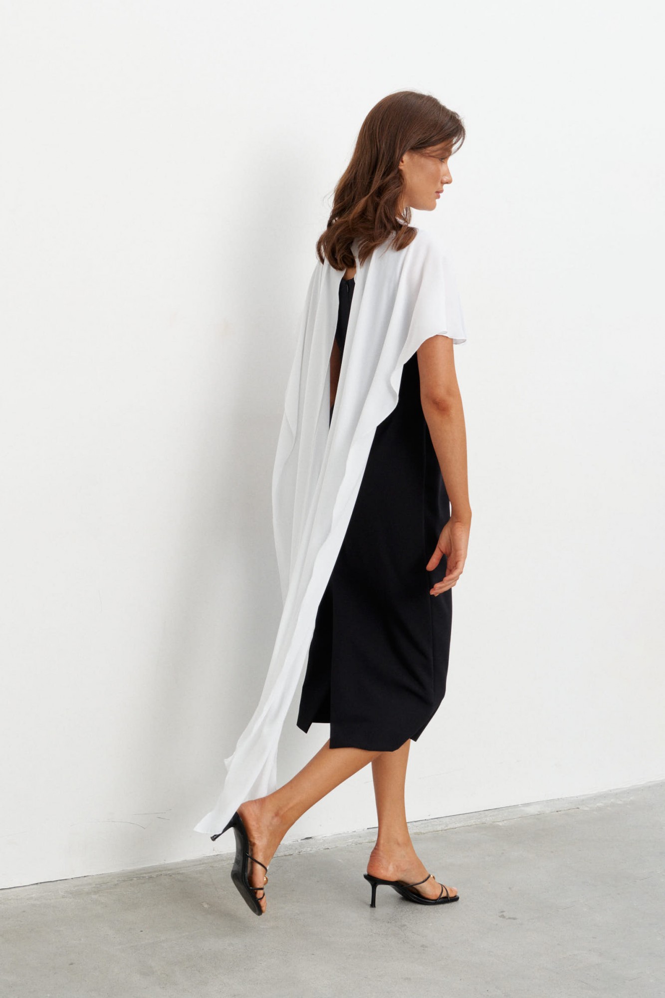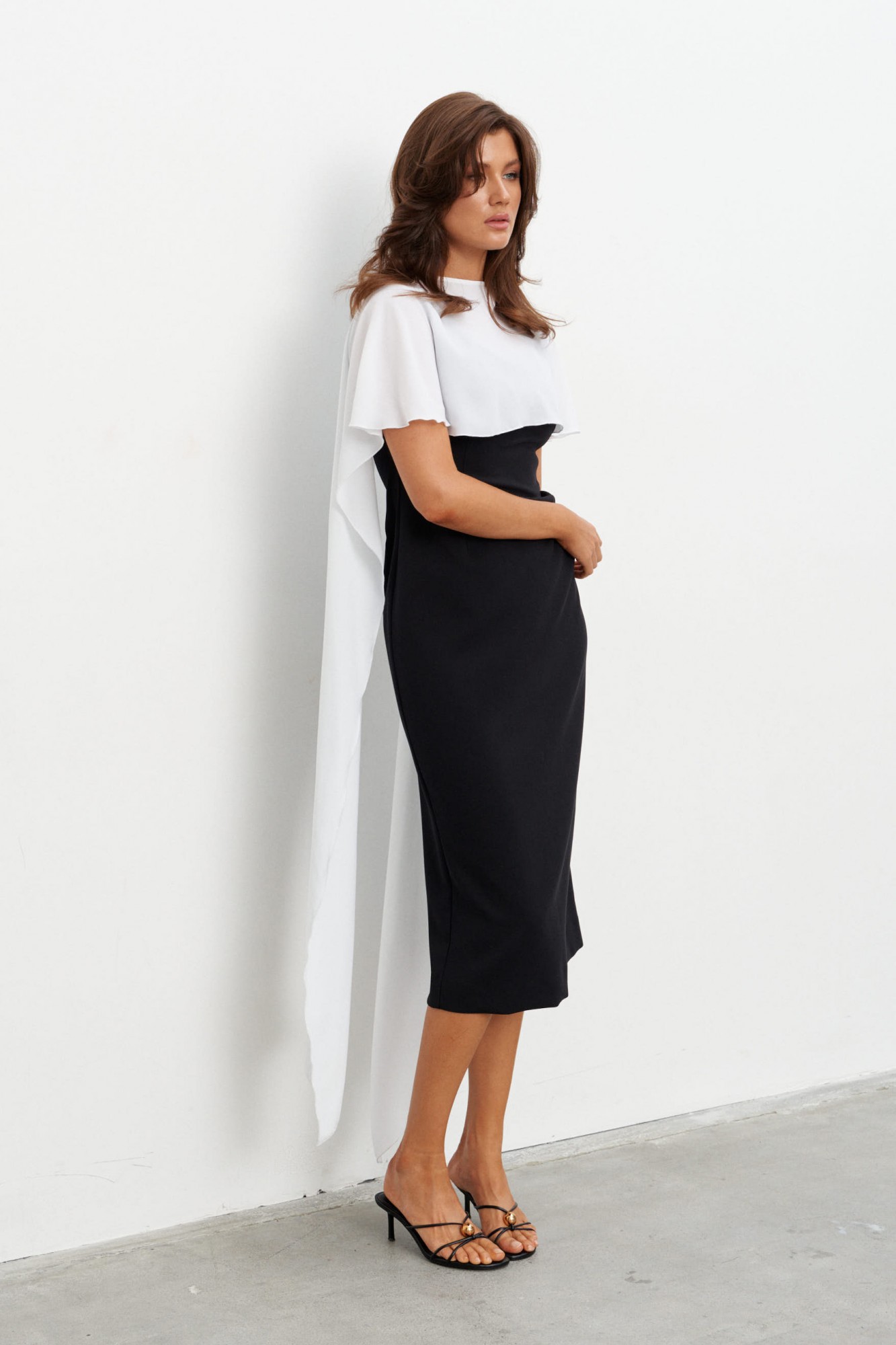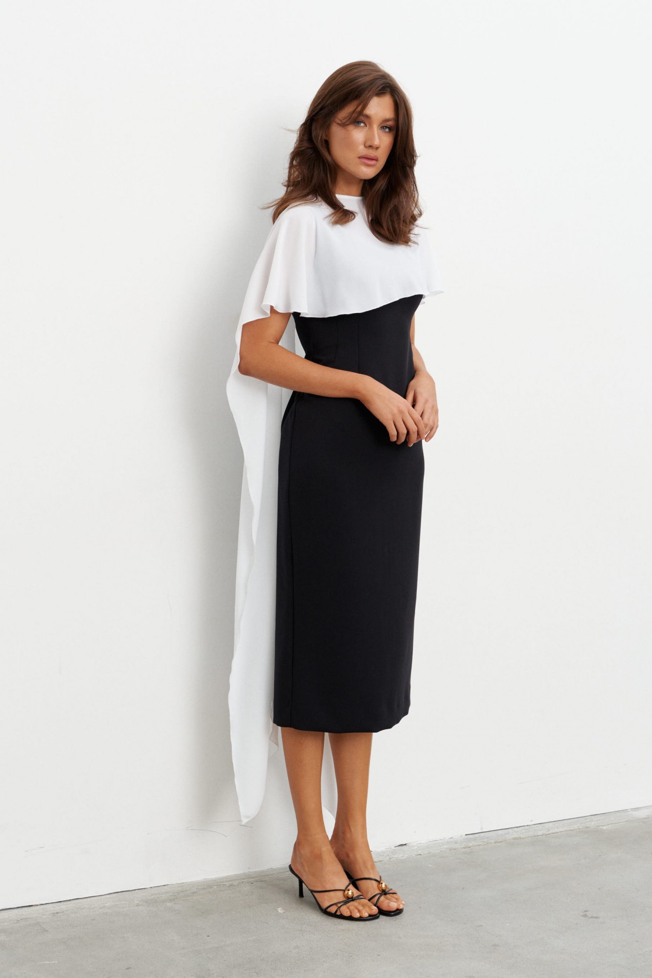 Комплект состоящий из плотного платья-футляра и струящейся, контрастной накидки. Платье прилегающего силуэта длиной миди. Вырез горловины - каре. Сзади шлица и застёжка на потайную молнию.