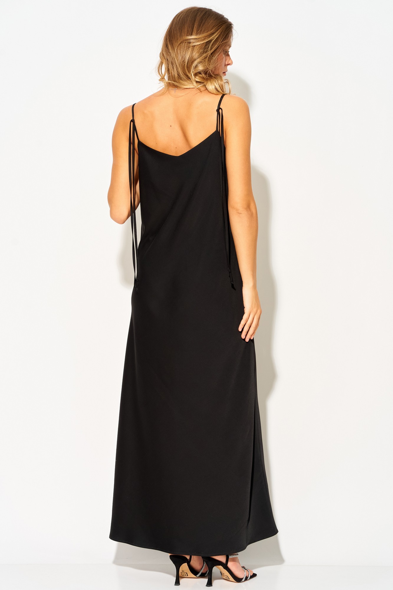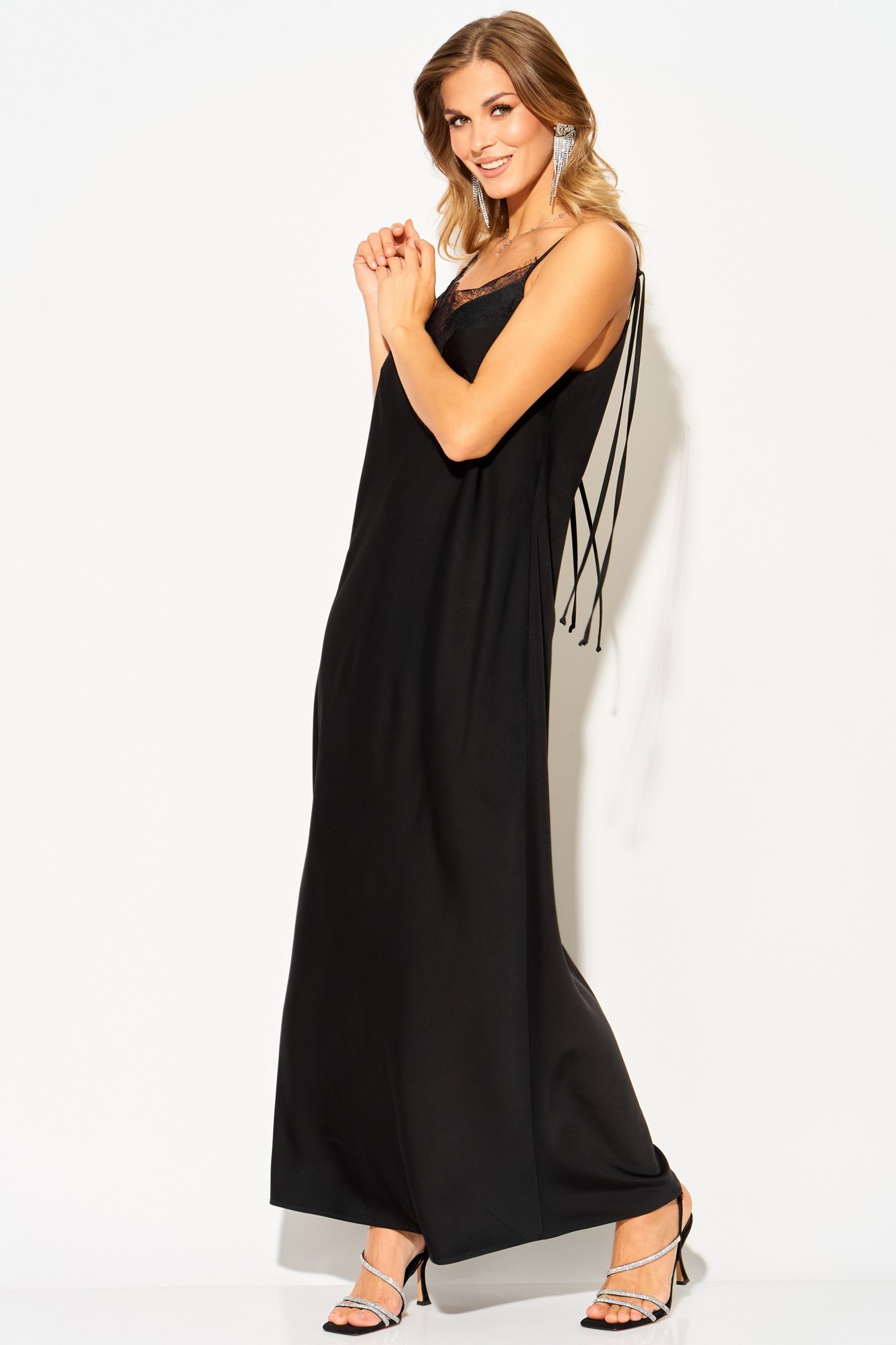 Платье полуприлегающего силуэта, длиной «в пол», на бретелях, с «V-образным» вырезом горловины спинки и переда. Деталь переда платья с нагрудными вытачками, горловина оформлена декоративным кружевом.