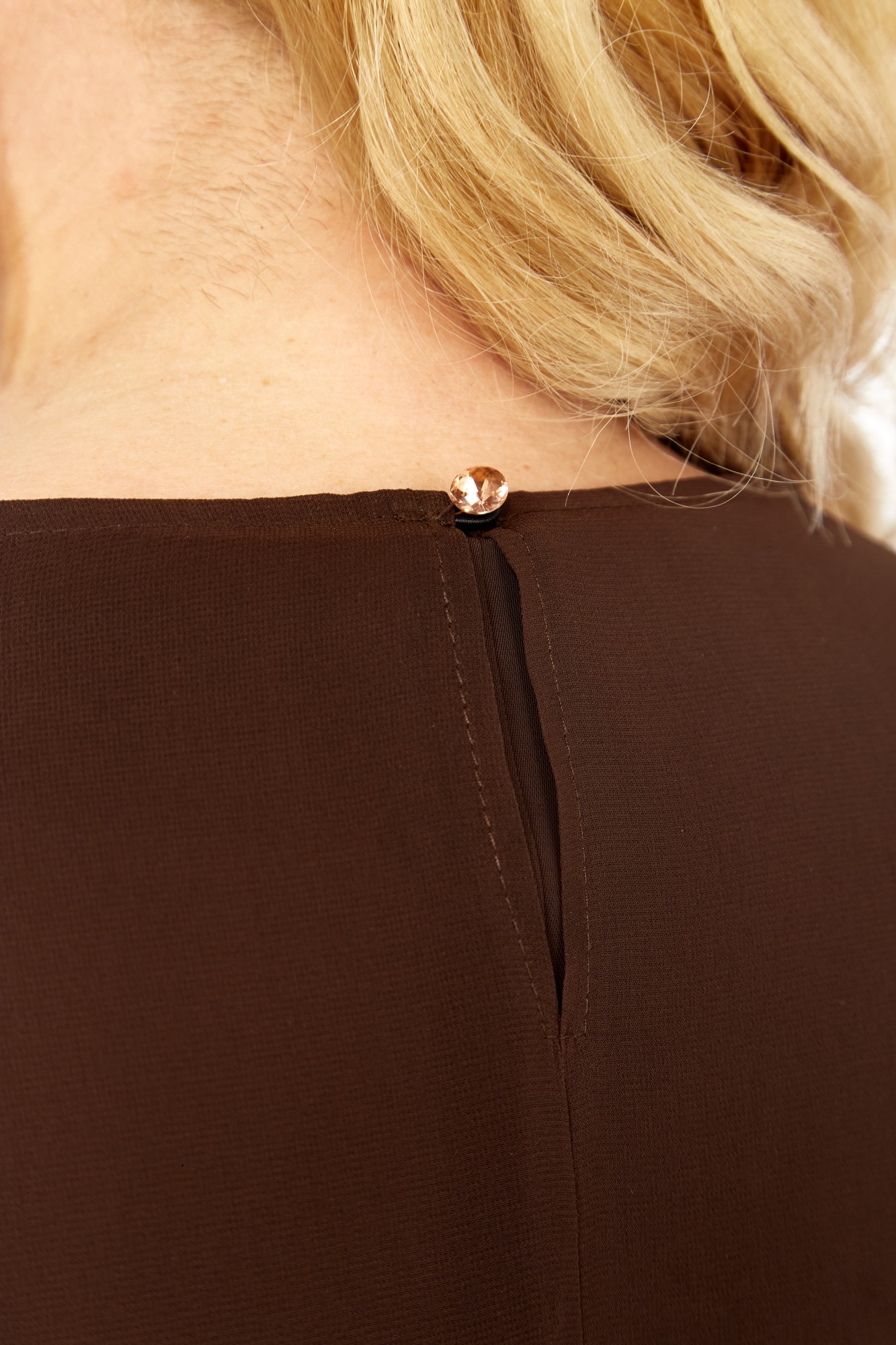 Нарядный женский двухпредметный комплект состоит из блузы ,выполненной из шифона двух видов,и платья, выполненного из однотонной плательно-костюмной ткани. Платье полуприлегающего силуэта, без рукавов. Перед с нагрудными вытачками из проймы. Спинка со средним швом, заканчивающимся шпицей, и таллиевыми вытачками. Вырез горловины -фигурное каре , обработан обтачкой. Проймы окантованы бейками. Блуза силуэта трапеция с втачными одношовными рукавами длиной 3/4,выполнена из гладкого шифона. Спинка удлиненная к центру, со средним швом и застёжкой на навесную петлю и пуговицу. Обтачка горловины переда, планки по низу блузы и рукавов, выполнены из отделочного шифона с бронзовым принтом.