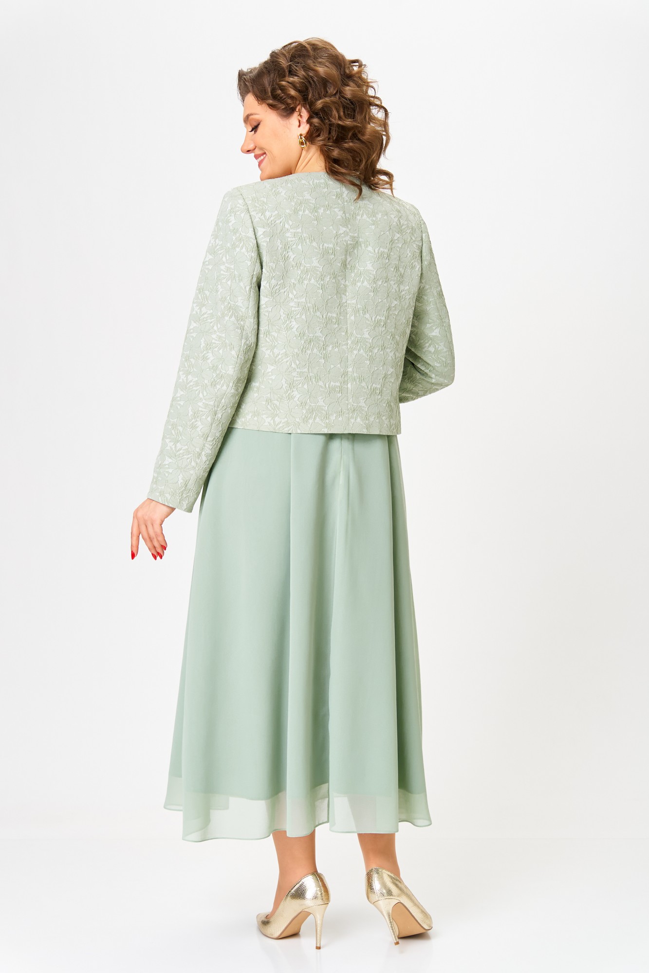 Элегантный женский комплект, состоит из платья и жакета. Платье выполнено из двух видов ткани, жаккарда и шифона. Лиф из жаккардовой ткани, с рельефными и центральным швом, горловины” V “ образная, проймы с крылышками из шифона. Застежка на тесьму молния в центральном шве спинки. Юбка из шифона, со складками по талии. Платье на подкладке. Жакет из жаккарда полуприлегающего силуэта без застежки, рукава втачные. Жакет без подкладки.