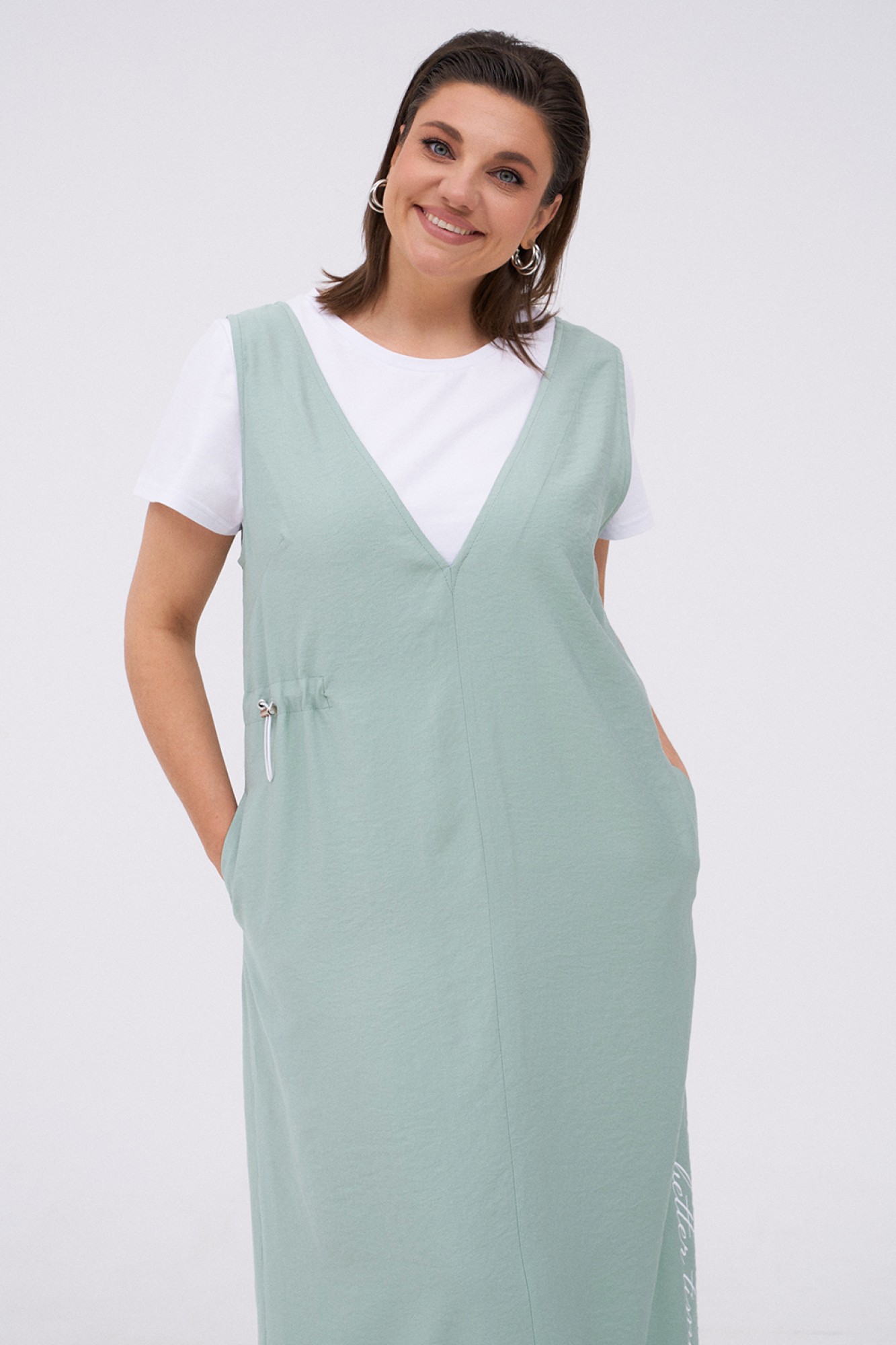 Комплект из 2 предметов: сарафан и футболка. Сарафан длины макси с углубленной линией декольте v-образной формы. По талии справа декоративная кулиса со шнуром и фиксатором. Вдоль бокового шва слева контрастный принт. Базовая женская футболка полуприлегающего силуэта. Рукав втачной, короткий. Горловина округлой формы, обработанная бейкой. Длина футболки до линии бедер.