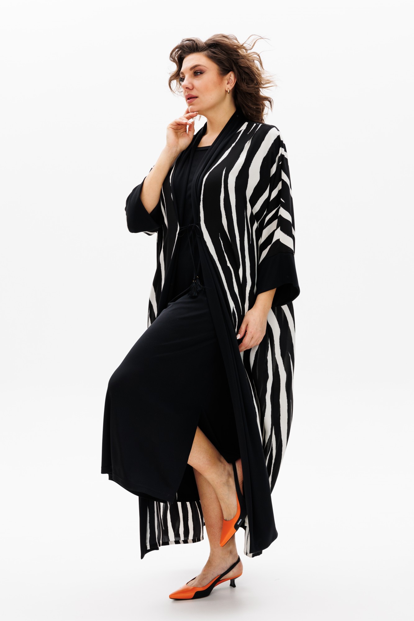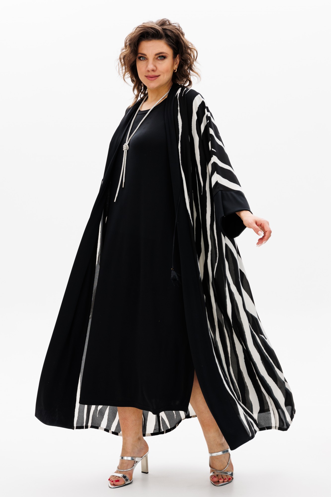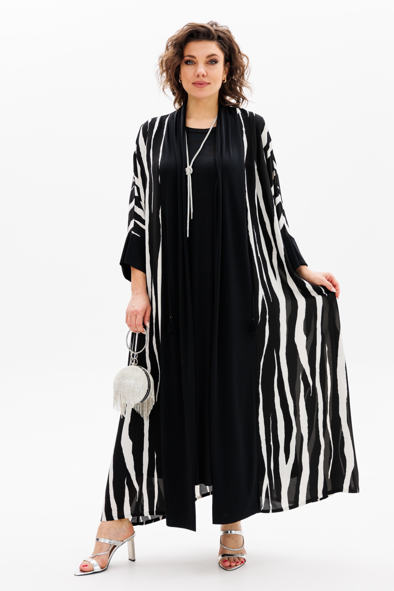 Нарядный и эффектный женский комплект, состоящий из двух предметов: длинного струящегося кардигана из шифона, который надевается поверх платья свободного кроя, с боковым разрезом. Кардиган длинный, декорирован завязками-кисточками. Планка борта и манжеты кардигана выполнены из контрастной ткани. Платье длинное с нагрудными выточками, спинка со средним швом, короткий втачной рукав, имеется боковой разрез.