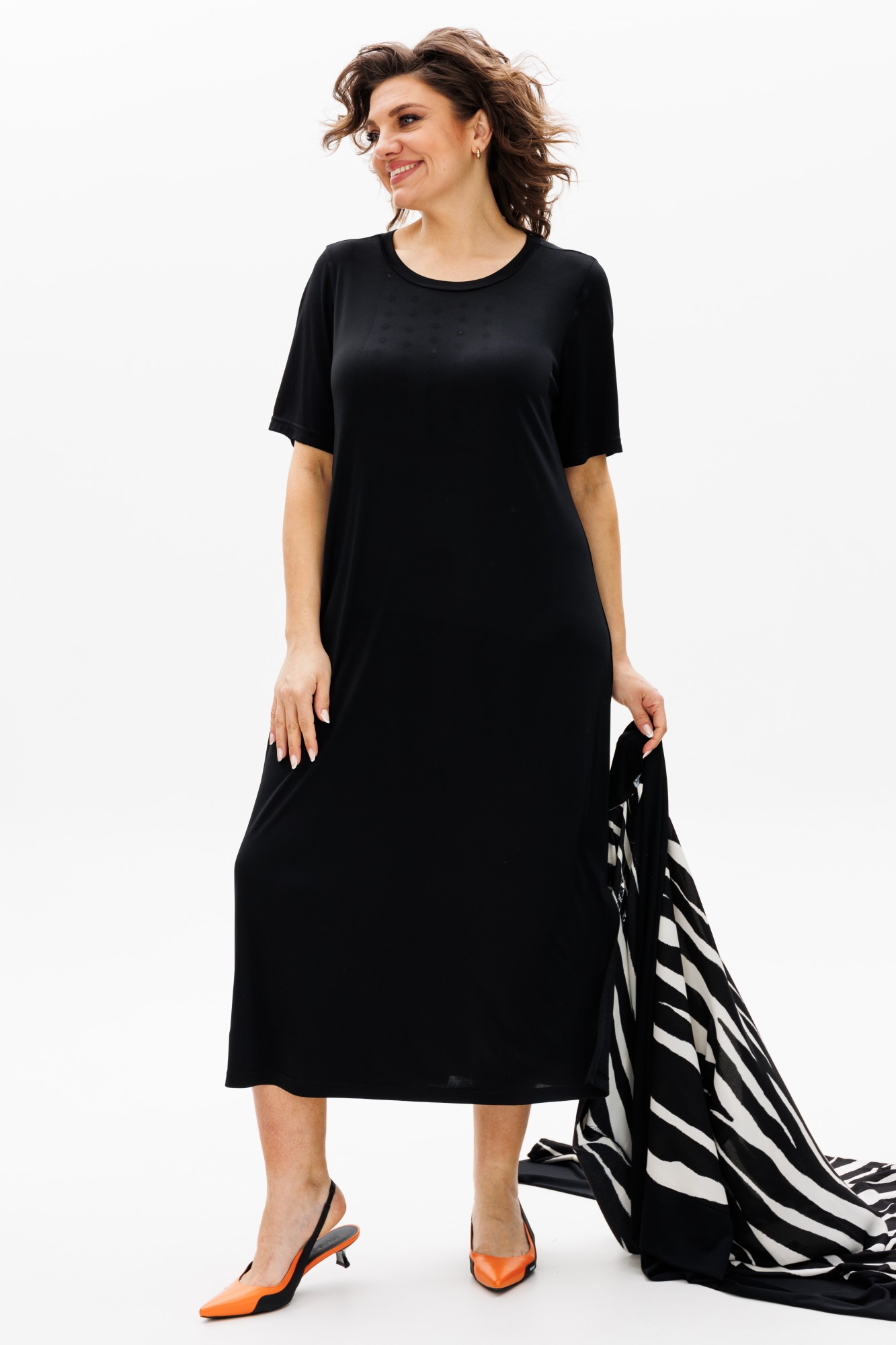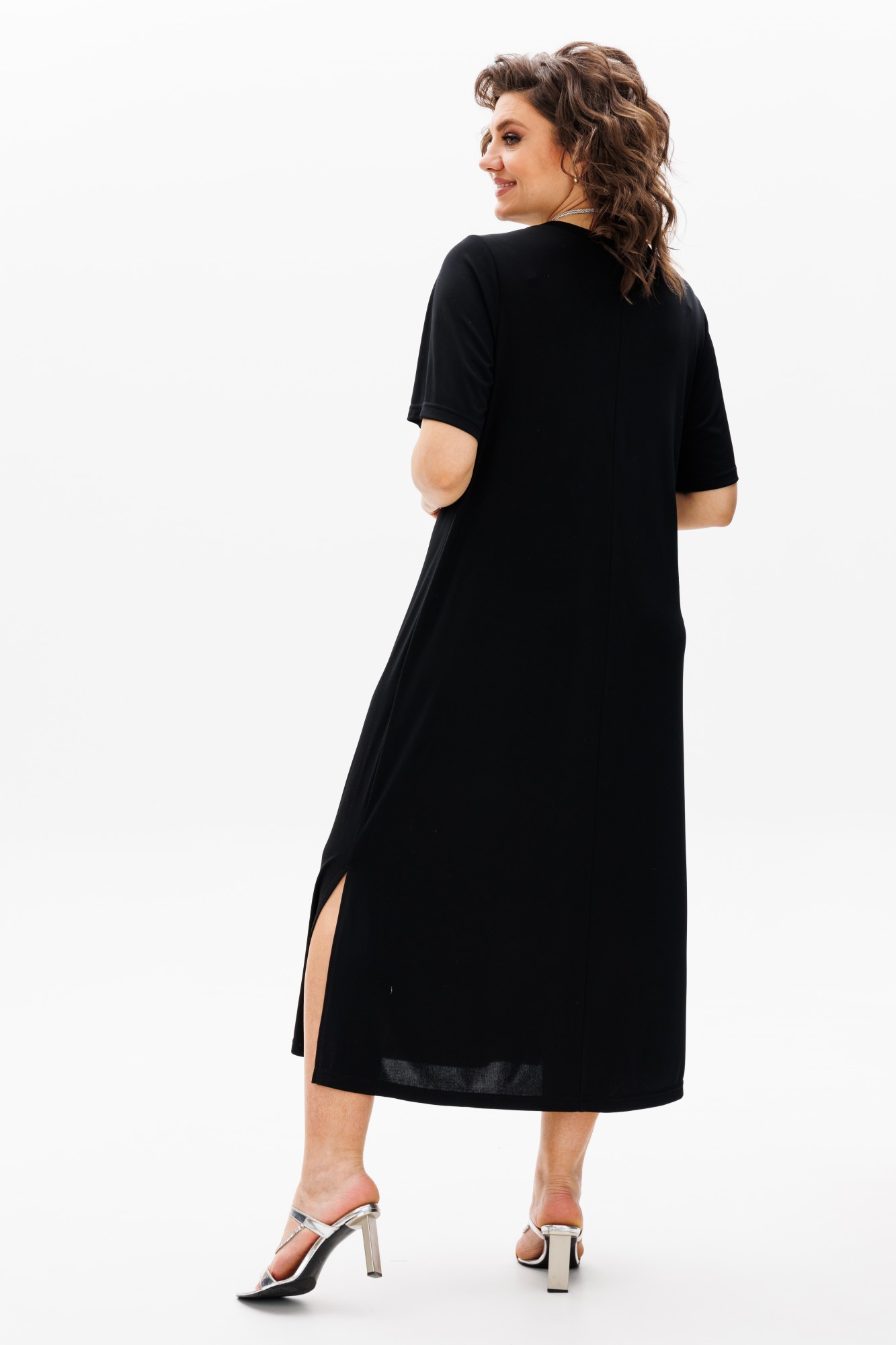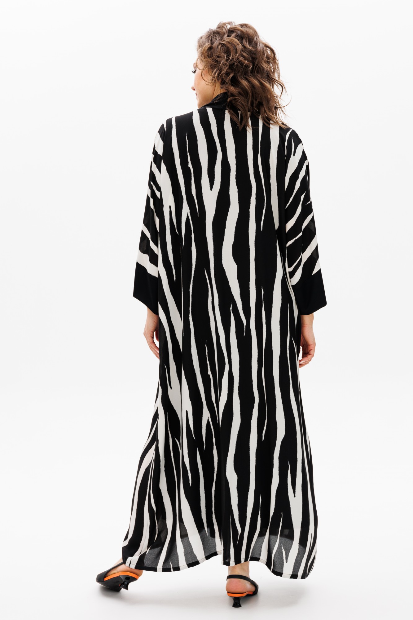 Нарядный и эффектный женский комплект, состоящий из двух предметов: длинного струящегося кардигана из шифона, который надевается поверх платья свободного кроя, с боковым разрезом. Кардиган длинный, декорирован завязками-кисточками. Планка борта и манжеты кардигана выполнены из контрастной ткани. Платье длинное с нагрудными выточками, спинка со средним швом, короткий втачной рукав, имеется боковой разрез.