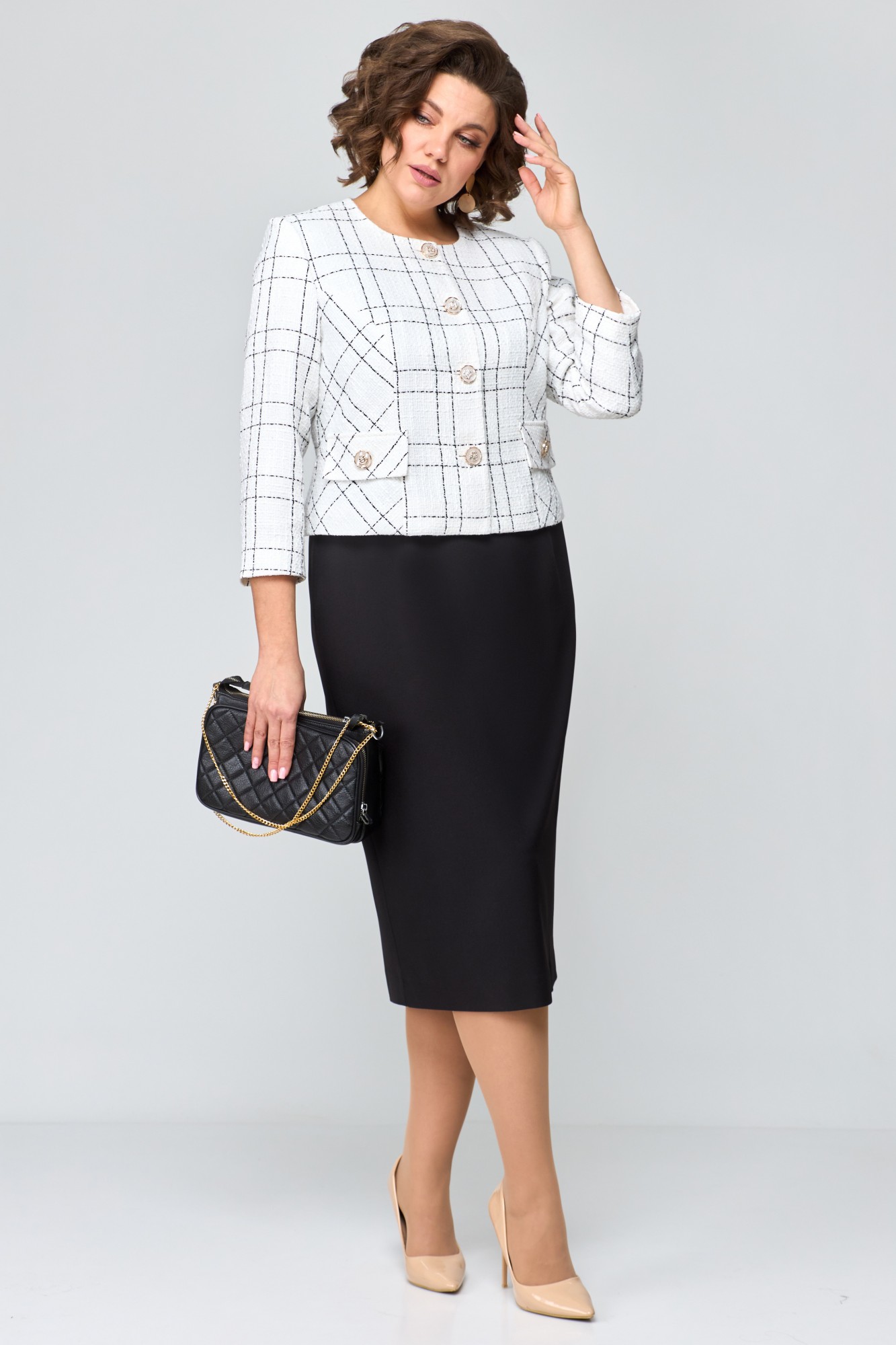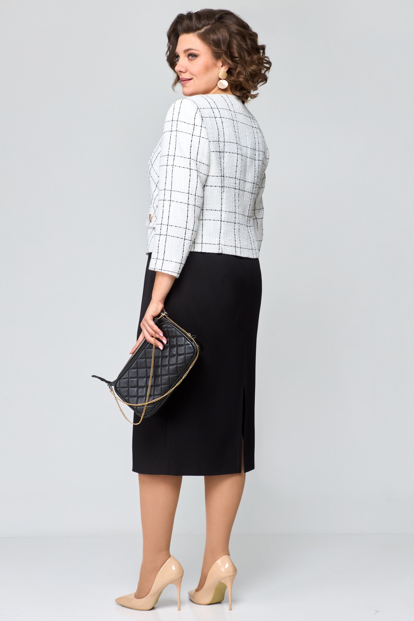 Красивый и стильный комплект в элегантном сочетании однотонного платья и жакета в клетку подойдет и для строгого образа, и для создания светлого, яркого и нежного лука с романтичными мотивами. Жакет слегка приталенного силуэта на подкладке без воротника с застежкой на 4 петли и пуговицы. По переду жакета клапаны с декоративной пуговицей. Рукав втачной двухшовный длиной 7/8. Спинка со средним швом и талевыми вытачками. Платье полуприлегающего силуэта на подкладке, слегка со спущенной линией плеча. По переду частичный подрез по талии. В среднем шве спинки потайная молния и разрез по низу. Образ дополняет ремень с оригинальной пряжкой.