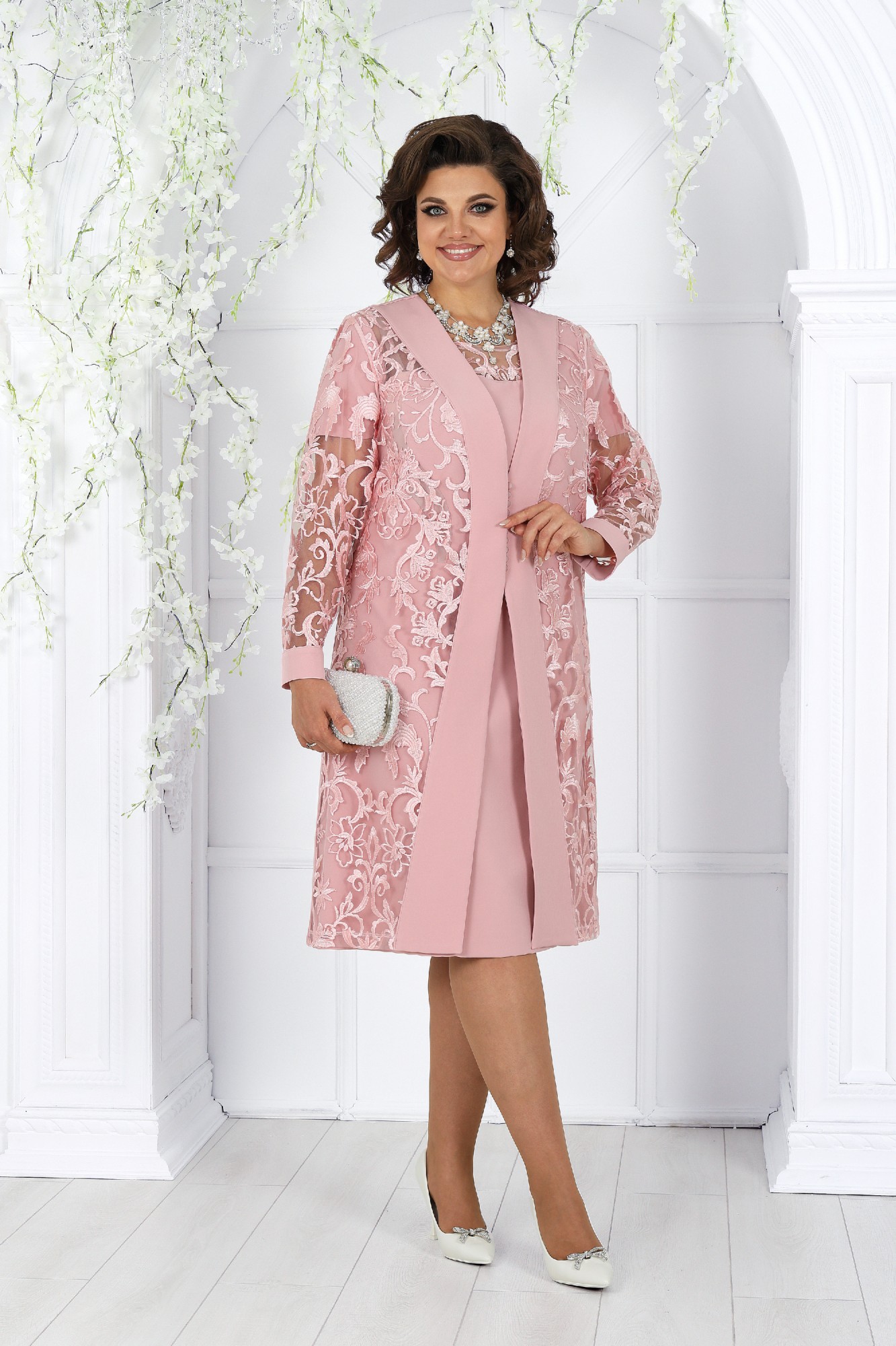 Представляем вашему вниманию вечерний женский костюм от NINELE - истинное воплощение изящества. Этот наряд собрал в себе лучшие модные свадебные тенденции: сочетание костюмной ткани с изысканным кружевом придает образу особую изысканность и стиль. Костюм идеально подойдет для свадебного торжества, вечернего мероприятия или другого особого случая, где вы захотите выглядеть неповторимо и элегантно. Особенностью данного костюма является кружевной кардиган, выполненный из кружева и основной ткани. Такой дизайн элегантно формирует правильный силуэт фигуры, подчеркивая ее достоинства. Комплект женский, 2-х предметный, состоящий из платья и кардигана, выполненных из костюмно-плательной ткани в сочетании с гипюром. Платье женское полуприлегающего силуэта, расширенное к низу, длиной по среднему шву спинки 103 см. Перед с фигурной кокеткой из гипюра, идущей от середины левого плеча и уходящей в правую пройму, с декоративной деталью по правой стороне, идущей от кокетки вниз до линии талии. Декоративная деталь 2-х слойная: верхний слой из гипюра, нижний из трикотажной подкладки. Перед с нагрудными вытачками, идущими: левая- из проймы, правая от декоративной детали. Спинка с таллиевыми вытачками, со средним швом, в верхней части которого обработана застежка на потайную тесьму-«молния». Горловина спинки округлая, обтачная. Горловина переда округлая, углубленная, срез обработан на плоскошовной машине. Рукава втачные, одношовные. Длина рукавов 21 см.