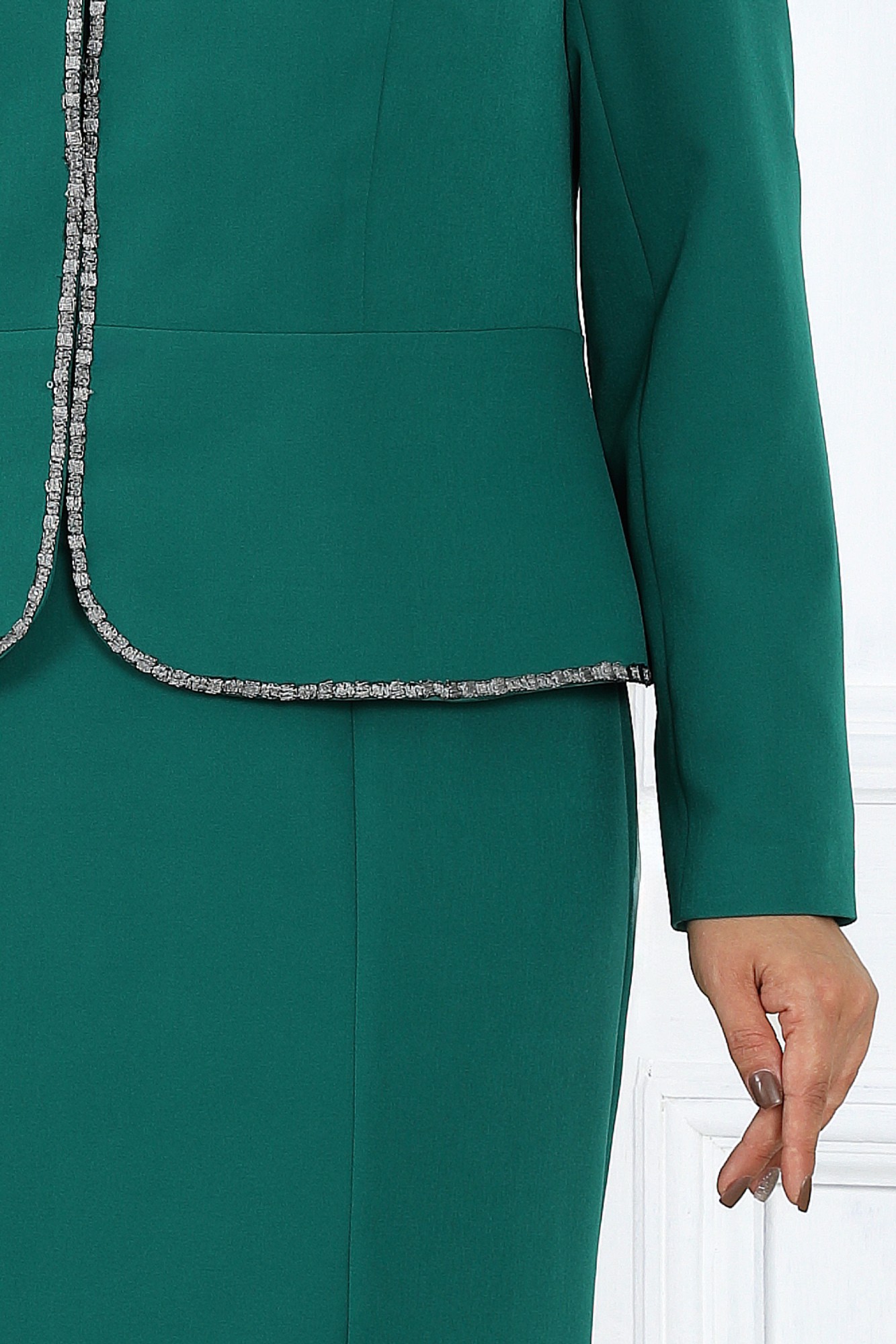 Этот костюм подойдет для женщин, предпочитающих классический стиль с элементами изысканности, удобное лекало и продуманные детали обеспечивают комфорт в больших размерах, делая комплект идеальным выбором для полных женщин. Прекрасный вариант для тех, кто ищет сочетание офисного и праздничного наряда. Комплект женский 2-х предметный, состоит из жакета и платья, из костюмно-плательной ткани. Жакет полуприлегающего силуэта, отрезной по линии талии, на подкладке. Длина по среднему шву спинки 55,0 см. Перед с рельефными швами из проймы до шва по линии талии проходящими через центр груди, с центральной застежкой на 8 потайных крючков, борта закруглённые. Спинка со средним швом, с рельефными швами из проймы до шва по линии талии. Горловина переда и спины округлая, углублённая спереди, обтачная. Рукава втачные, двушовные, длиной 61,0 см. Горловина, край борта и низ жакета украшены декоративной тесьмой. Изделие с плечевыми накладками. Платье прилегающего силуэта, зауженное к низу, на подкладке. Длина по среднему шву спинки 107,0 см. Перед с рельефными швами из плечевого шва до низа, проходящие через центр груди, с отрезной по линии талии центральной частью, на верхней детали которой обработаны декоративные швы в виде ромбов, украшенные стеклярусом. Спинка с талевыми вытачками, с средним швом, в верху которого обработана застёжка на потайную тесьму-«молнию», по низу шва обработана шлица. Горловина обтачная, углублённая спереди, круглая. Рукава втачные, одношовные, длиной 27,0 см. Изделие с плечевыми накладками.