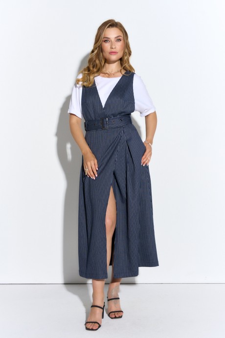 Комплект-двойка из сарафана и трикотажной футболки. Сарафан из текстиля полуприлегающего силуэта. Лиф с v-образным глубоким вырезом, юбка расширенного силуэта с запахом длиной миди, на притачном поясе, имеет дополнительно съемный пояс. Карманы в боковых швах, застежка на потайную молнию по спинке, без подкладки. Трикотажная майка прямого покроя с цельнокроеным рукавом с отворотом.
