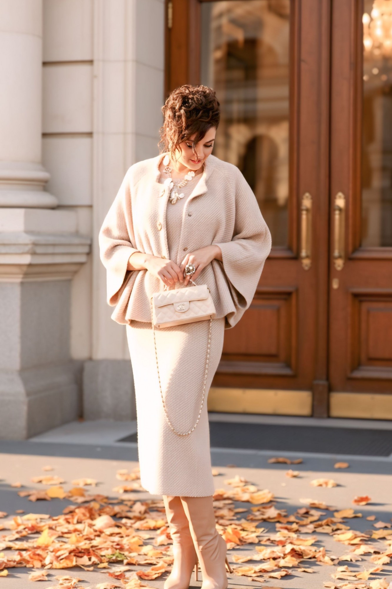Комплект женский состоящий из жакета и платья. Жакет «оверсайз» свободного силуэта, с центральной застёжкой на потайные кнопки по краю борта. Горловина в жакете округлой формы с прилегающим воротником-стойкой. Рукав по форме летучая-мышь с фигурной линией низа. По переду платья рельеф уходящий в рукав. Спинка со средним швом. Боковые швы жакета переходят на перёд. В качестве дополнительного декоративного элемента по краю борта жакета декоративные украшения в виде брошек.