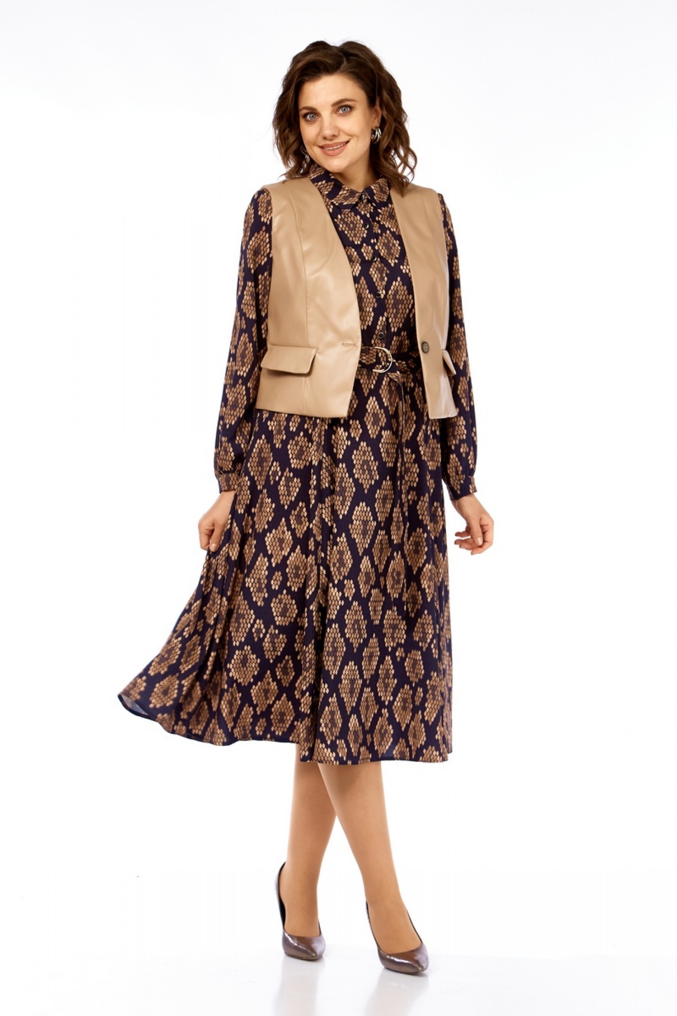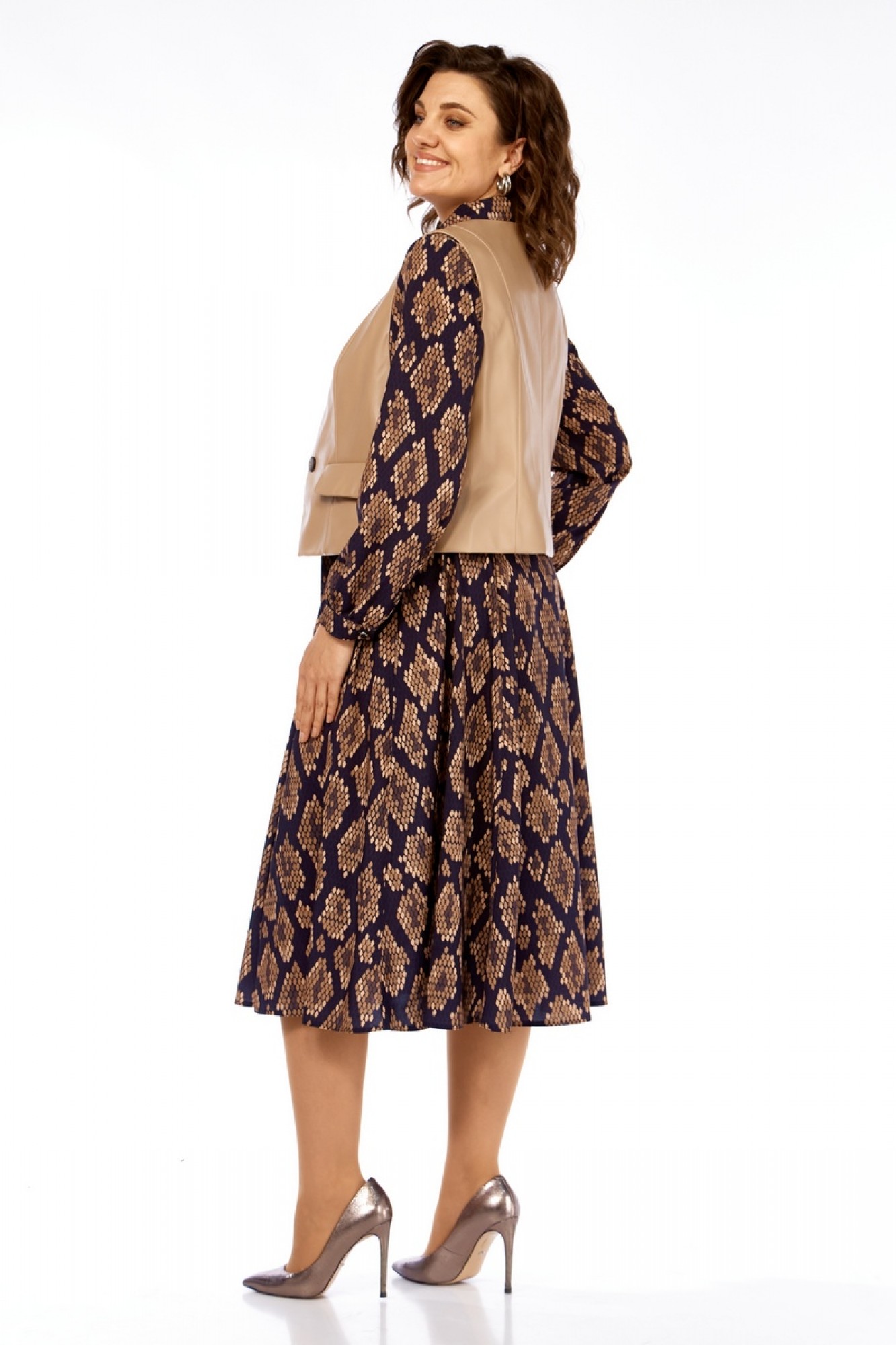 Комплект женский, состоящий из платья и жилета. Платье свободного силуэта, трикотажное, без подкладки. Рукав втачной, снизу собран на манжету, манжета застегивается на петлю и пуговицу. По талии платье отрезное, спереди до талии планка на петли и пуговицы и нагрудные вытачки, которые позволяют создать идеальную посадку по груди. Юбка-шестиклинка. Дополнительно в комплекте к платью присутствует пояс из основной ткани. Жилет полуприлегающего силуэта из эко-кожи, с накладными декоративными клапанами, застежка на одну петлю и пуговицу.