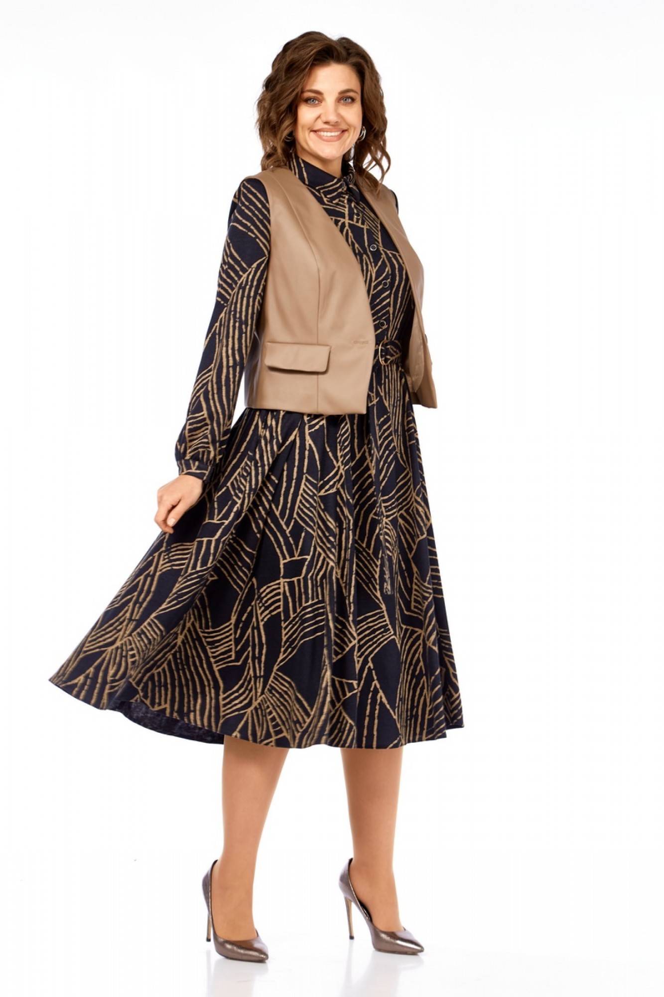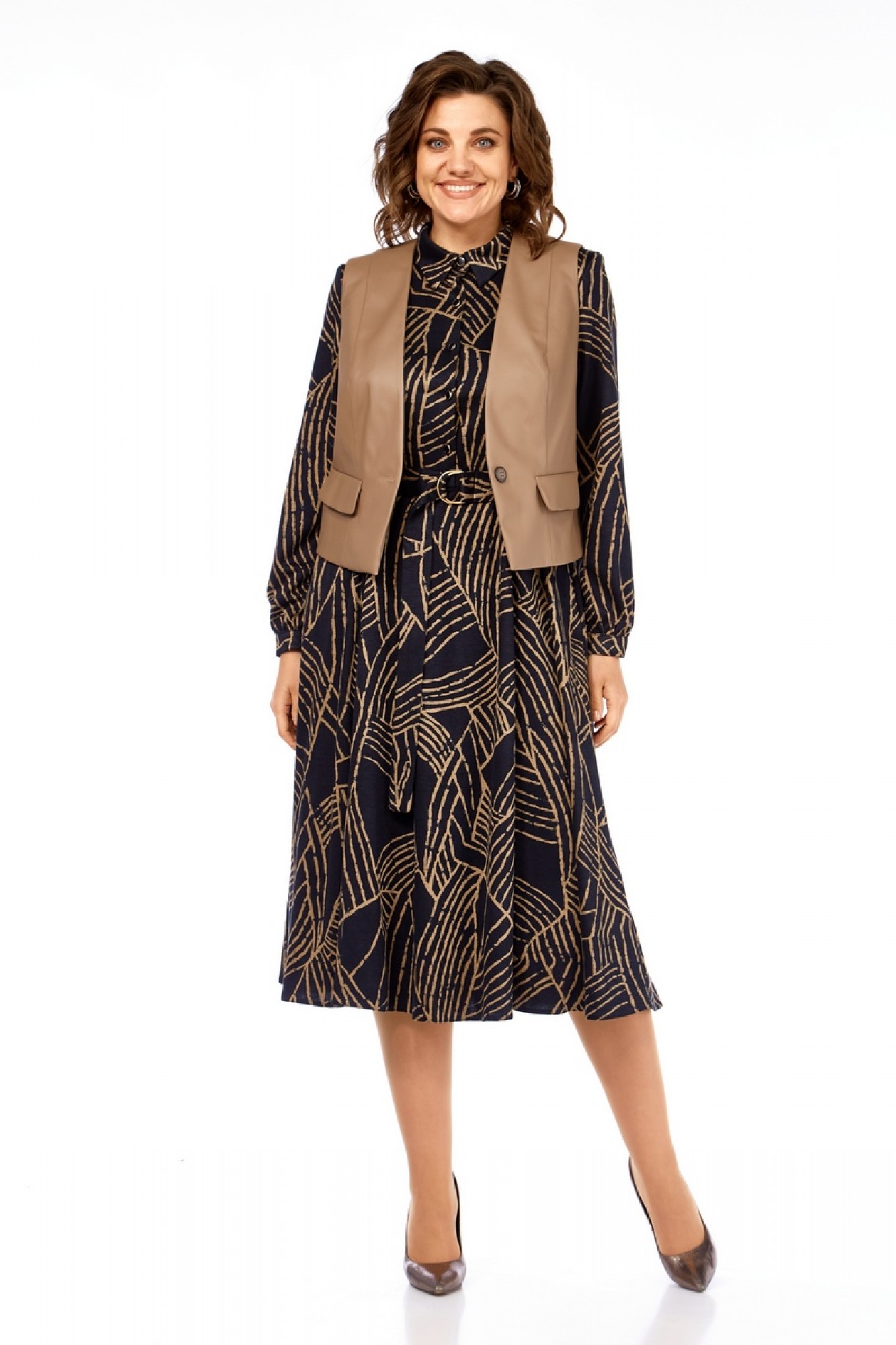 Комплект женский, состоящий из платья и жилета. Платье свободного силуэта, трикотажное, без подкладки. Рукав втачной, снизу собран на манжету, манжета застегивается на петлю и пуговицу. По талии платье отрезное, спереди до талии планка на петли и пуговицы и нагрудные вытачки, которые позволяют создать идеальную посадку по груди. Юбка-шестиклинка. Дополнительно в комплекте к платью присутствует пояс из основной ткани. Жилет полуприлегающего силуэта из эко-кожи, с накладными декоративными клапанами, застежка на одну петлю и пуговицу.