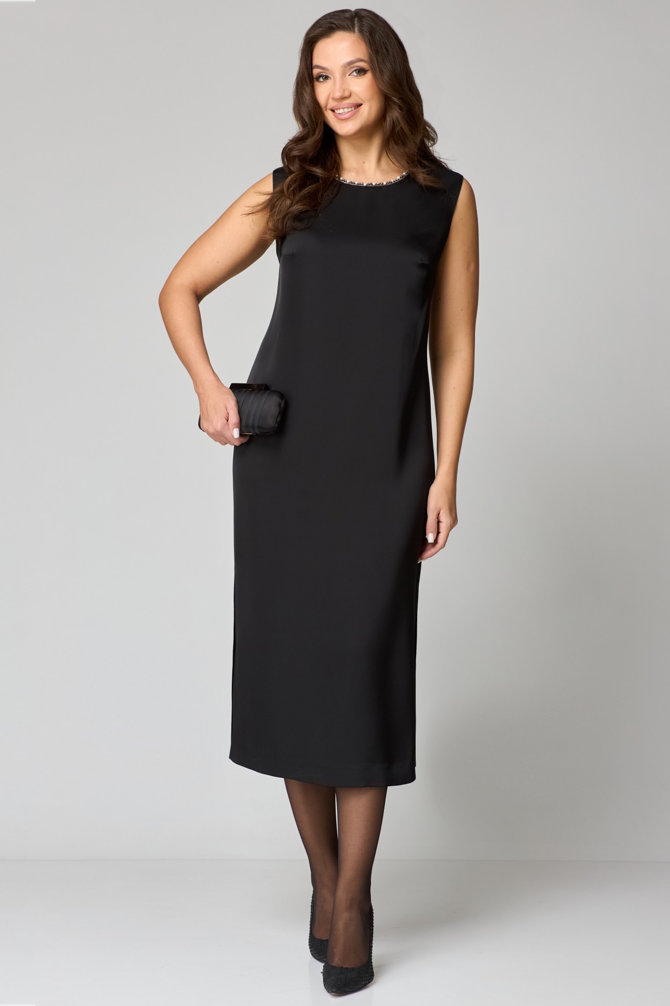 Комплект женский 2-ух предметный состоящий из блузки и платья. Платье прямого силуэта выполнено из атласа. Вырез горловины округлой формы, по горловине настрочена декоративная тесьма с бусинами и жемчугом. По переду застрочены нагрудные вытачки. Спинка со средним швом и талевыми вытачками. Застежке сзади на потайную тесьму молнию. По бокам имеются разрезы. Платье без рукавов. Блузка укороченная полуприлегающего силуэта выполнено из вискозы. Воротник стояче-отложной. Рукав втачной, одношовный по низу рукава легкая сборка, притачная манжета застегивается на 1 пуговицу и петлю. По низу блузки притачной пояс с помощью которого, можно красиво подчеркнуть линию талии.