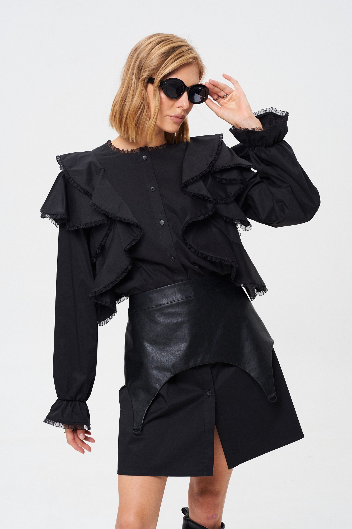 Платье свободного силуэта, декорировано воланами с тесьмой. В комплекте юбка-баска из экокожи. Эти элементы создают неповторимый образ и отличают от всех стандартных платьев. Вы точно обратите на себя внимание!