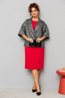 Нарядный женский комплект, состоящий из жакета и платья. Жакет прямого силуэта на подкладке со спущенной линией плеча, выполнен из костюмной ткани, расшитой пайетками (тянется). По переду функциональные прорезные карманы с листочкой, центральная двубортная застежка на петли-пуговицы. Горловина оформлена воротником пиджачного типа с лацканом. Спинка цельная. Рукава одношовные с притачной манжетой. Платье полуприлегающего силуэта со спущенной линией плеча, выполненное из плательной ткани (тянется) без подкладки. По переду нагрудные вытачки. Спинка со средним швом, таллиевыми вытачками и разрезом по низу. Застежка на потайную тесьму-молнию в среднем шве спинки. Горловина округлой формы, обработана окантовкой.