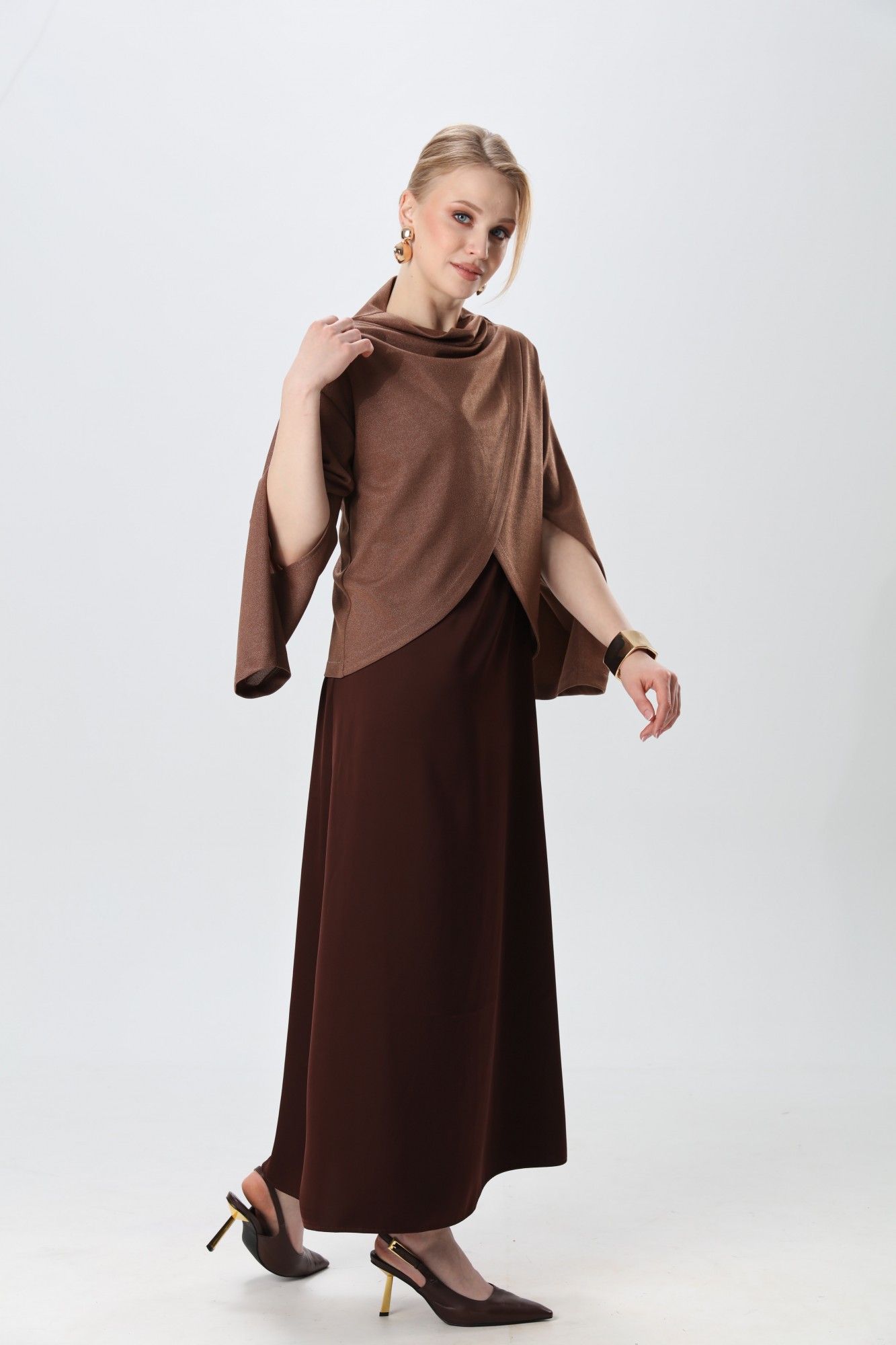 Костюм двухпредметный: состоит из джемпера и платья. Элегантный укороченный джемпер-кейп прямого свободного силуэта с округлой горловиной и фигурным лифом. Рукав втачной широкий, от линии локтя до запястья есть дополнительное отверстие для рук. Платье прямого силуэта, с небольшим расширением к низу, длиной макси. Перед с нагрудной вытачкой из бокового шва. Вырез горловины переда и спинки имеют V-образную форму.