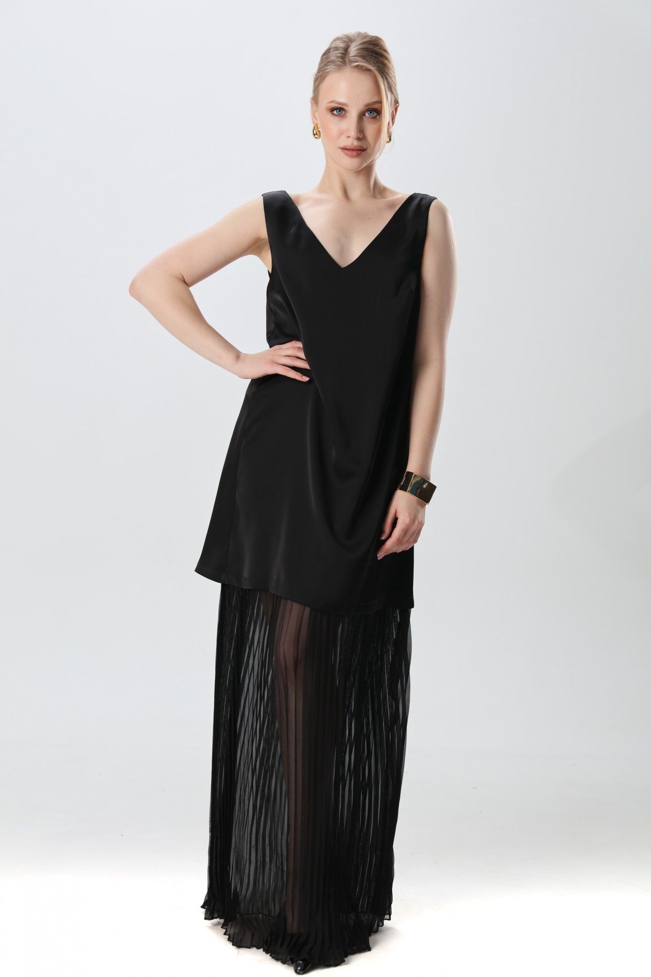 Костюм двухпредметный: состоит из платья и жилета. Платье прямого силуэта, с небольшим расширением к низу, длиной макси. Перед с нагрудной вытачкой из бокового шва. Вырез горловины переда и спинки имеют V-образную форму. Низ платья декорирован воланом из гофрированного шифона. Жилет из экокожи прямого силуэта с воротником пиджачного типа. По правой пройме переда расположена фигурная деталь "крылышко". Спинка со средним швом. По низу правого переда и низу правой спинки фигурная деталь. По левой части переда и левой части спинки отлетная кокетка. Изделие идёт в комплекте с ремнем из экокожи.