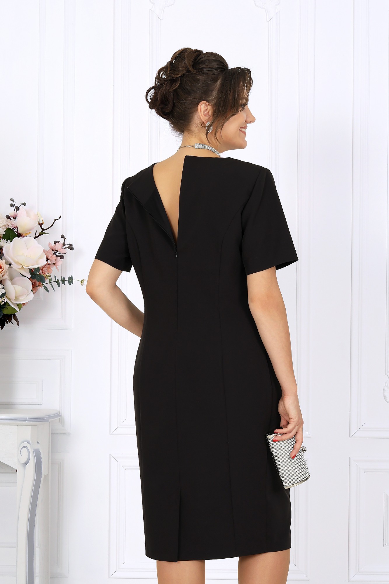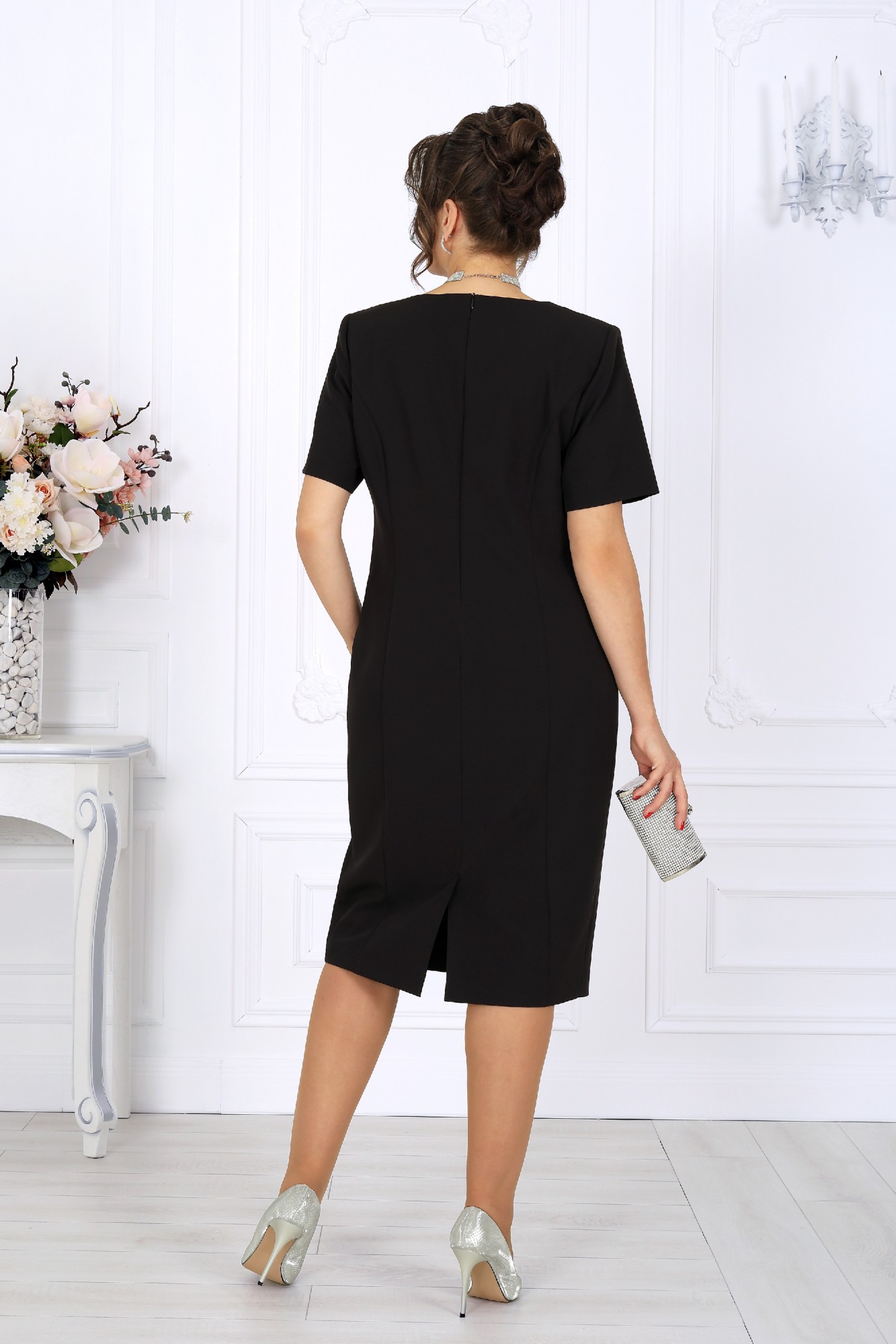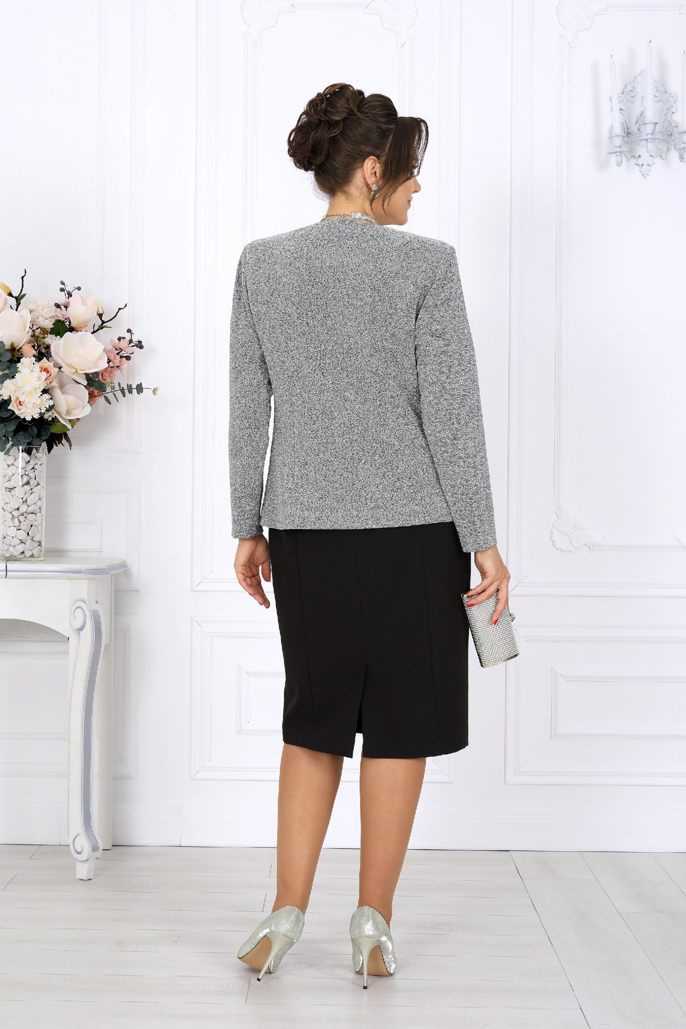 Этот костюм — гармония классики и современности, сдержанная роскошь и продуманная функциональность. Жакет выполнен из трикотажного полотна с благородным мерцанием люрекса - лёгкое свечение ткани придаёт образу торжественность и статусность. Фигурный крой бортов с асимметричной застёжкой визуально вытягивает силуэт, делая талию более выразительной. Подкладка и аккуратные плечевые накладки формируют чёткий, «дорогой» контур, характерный для премиальных моделей. Платье классической длины с утончённой формой выреза придают образу элегантность, а продуманная конструкция со шпицей на спинке гарантирует свободу движений. Этот костюм создан для женщин, которые знают себе цену и выбирают безупречное качество. Он одинаково уместен и в офисе, и на торжестве, и в ресторане — достаточно лишь сменить аксессуары. В нём вы будете чувствовать себя уверенно, женственно и благородно. Комплект женский, 2-х предметный, состоящий из жакета и платья. Жакет полуприлегающего силуэта, выполнен из трикотажного полотна с фактурной лицевой стороной «люрекс». Модель на трикотажной подкладке, с плечевыми накладками. Перед с нагрудными вытачками, направленными от проймы; спинка – с таллиевыми. Фигурные борта фиксируются на запах по линии горловины при помощи внутренней застежки на 2 петли и 2 потайные пуговицы и внешней застежки - на 2 петли и 2 декоративные пуговицы, обтянутые основным материалом. Горловина округлой формой, спереди углубленная. Рукав втачной, длинный. Платье полуприлегающего силуэта, выполнено из костюмно-плательной ткани. Модель на трикотажной подкладке, с плечевыми накладками. Перед и спинка с рельефными швами, направленными от проймы до низа. В верхней части среднего шва спинки обработана застежка на потайную тесьму-«молнию» (50см); в нижней части шва – шлица. Горловина округлой формы, спереди углубленная. Рукав втачной, короткий.