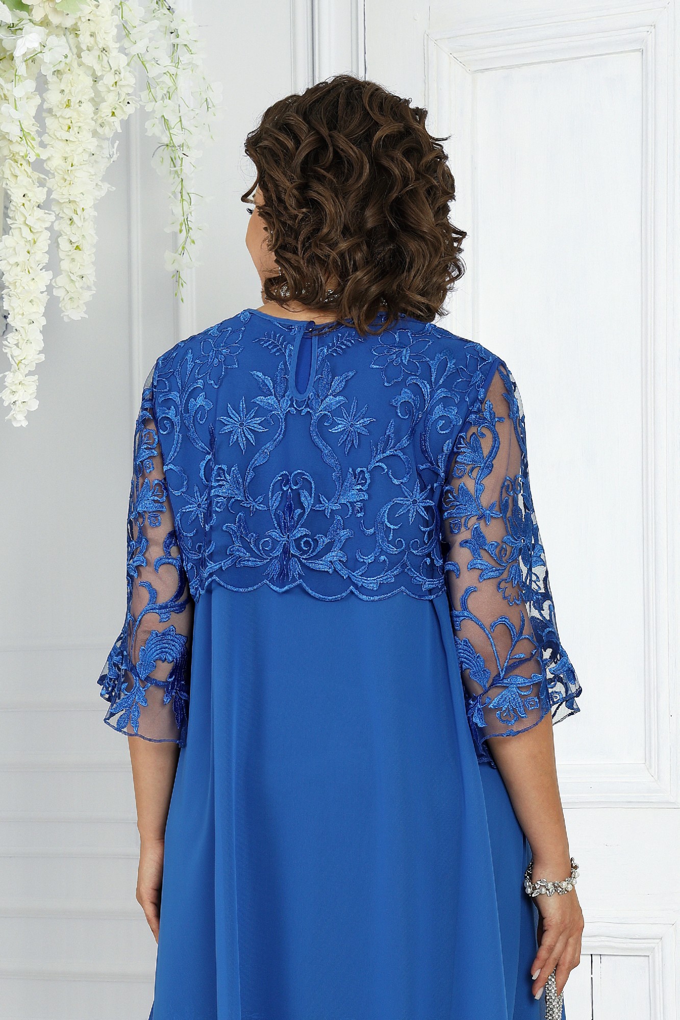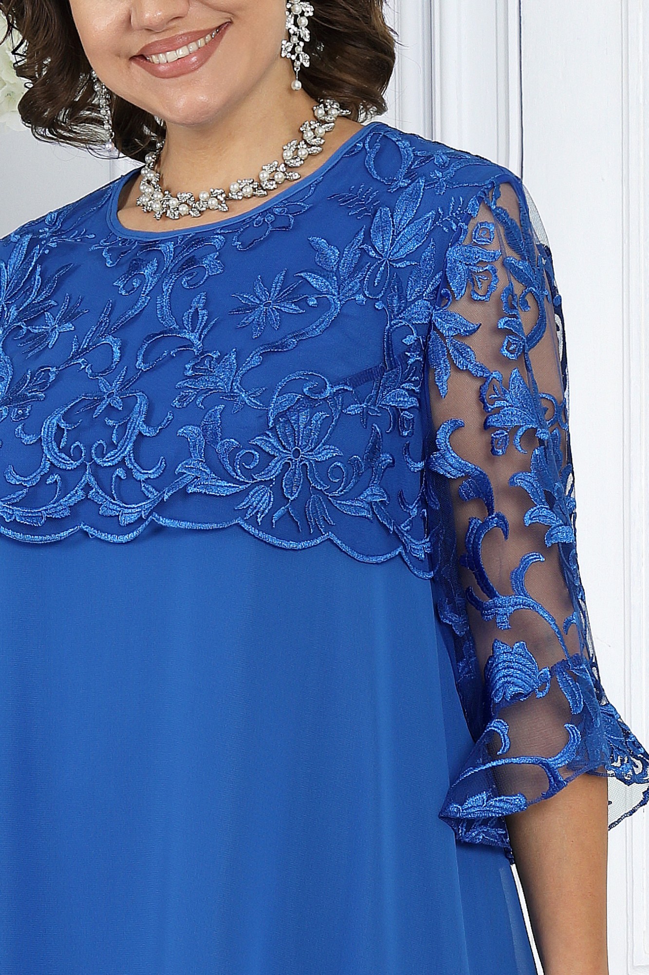 Этот комплект идеально подходит для создания нарядного образа на любое важное событие или вечерний выход. Он гармонично сочетает в себе стиль и комфорт, позволяя вам выглядеть безупречно. Туника А-образного силуэта выполнена из легкого шифона и гипюра, что придает ей воздушность и нежность. Платье полуприлегающего силуэта из трикотажного полотна и гипюра идеально сидит на фигуре, мягко подчеркивая линии тела. Завершающим штрихом становятся фестоны по низу платья, придающие ему завершенность и особый шарм. Комплект женский 2-х предметный, состоящий из туники и платья. Туника А-образного силуэта, выполнена из шифона и гипюра. Модель без подкладки и плечевых накладок. В верхней части переда и спинки - отлетные кокетки из гипюра. Перед с нагрудными вытачками, направленными от пройм, и асимметричным низом, укороченным посередине и удлиненным к боковым швам. Горловина круглой формы, спереди обработанная узкой косой бейкой, на спинке дополненная разрезом «капля» с застежкой на навесную петлю и декоративную пуговицу. Рукав длиной 3/4, втачной, с воланом по низу. Низ кокетки оформлен фестонами. Длина туники (спинка)-102 см, длина туники (перед)-85 см; длина рукава-40 см. Платье женское полуприлегающего силуэта, выполнено из трикотажного полотна и гипюра. Модель без застежки и подкладки, без рукавов и плечевых накладок. Спинка с таллиевыми вытачками; перед - с нагрудными, направленными от пройм. Круглая горловина и проймы обработаны узкой косой бейкой. В нижней части платья расположен горизонтальный подрез, в шов которого входит второй слой из гипюра. Низ изделия оформлен фестонами. Длина платья-106 см.