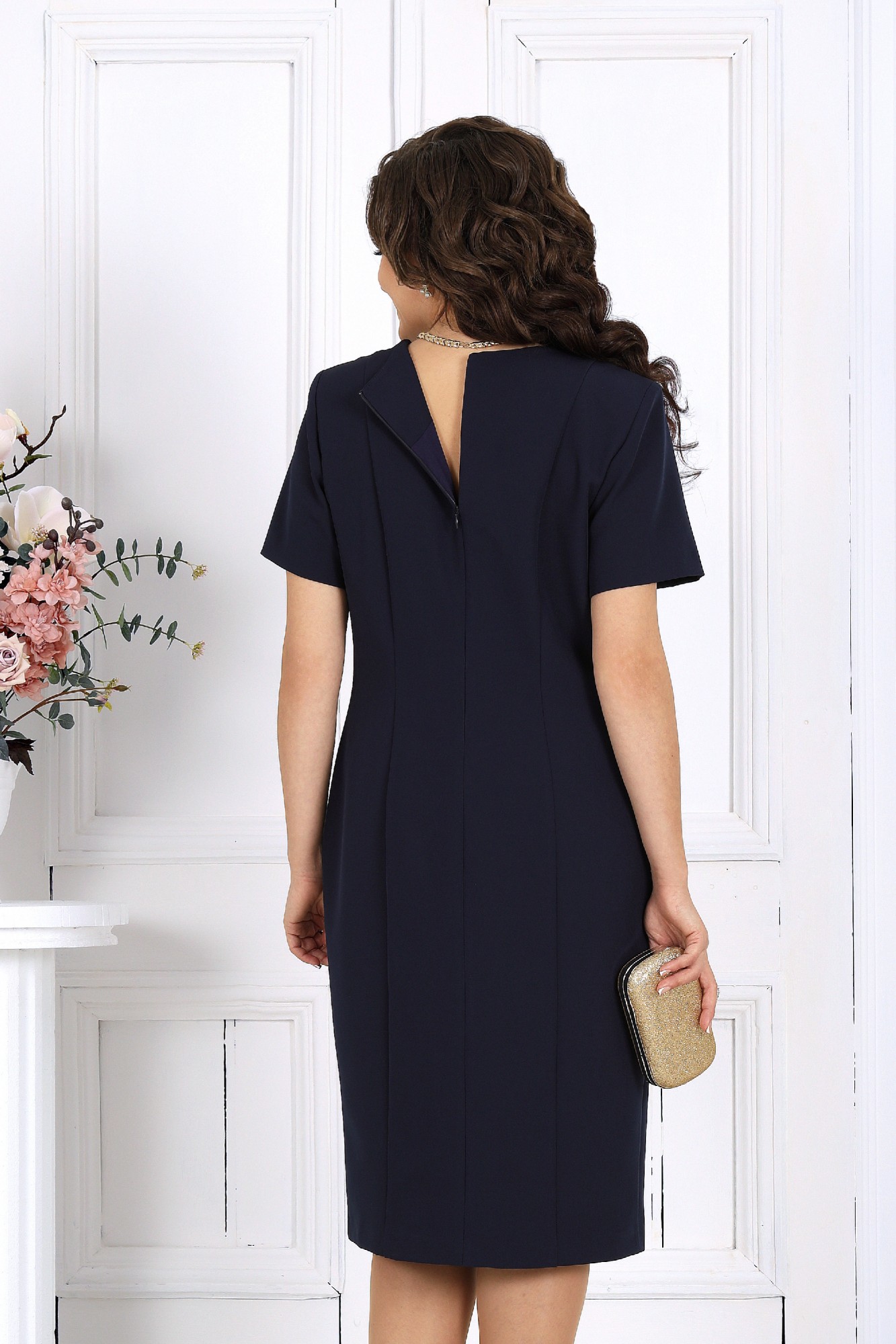 Этот вечерний костюм создан для женщин, которые ценят роскошь в деталях и хотят выглядеть безупречно на любом торжестве — будь то Новый год, свадьба, юбилей или праздничный вечер. Костюм сочетает в себе утончённость, комфорт и продуманную посадку, которые делают образ стройным, уверенным и безупречно нарядным. Лёгкая кружевная накидка из гипюра создаёт эффект многослойности и скрывает зону рук, делая образ благородным и элегантным. Силуэт свободный, комфортный, с аккуратной застёжкой на декоративную пуговицу. Кружевное красиво играет на свету и подчёркивает праздничное настроение. Комплект женский 2-х предметный, состоящий из платья и накидки. Платье женское, полуприлегающего силуэта, выполнено из костюмно-плательной ткани. Модель на трикотажной подкладке. С плечевыми накладками. Перед с рельефами, направленными от плечевых швов; в нижней части левого рельефного шва обработан разрез, по шву настрочена аппликация, дополненная перламутровыми бусинами. Спинка с рельефами, направленными от плечевых швов; в верхней части среднего шва обработана застежка на потайную тесьму-«молнию» (50см). Горловина круглой формы, углубленная спереди. Рукав втачной, короткий. Накидка свободного кроя, выполнена из гипюра. Модель с застежкой спереди на декоративную пуговицу и навесную петлю. Горловина округлой формы, окантована узкой косой бейкой из костюмно-плательной ткани.