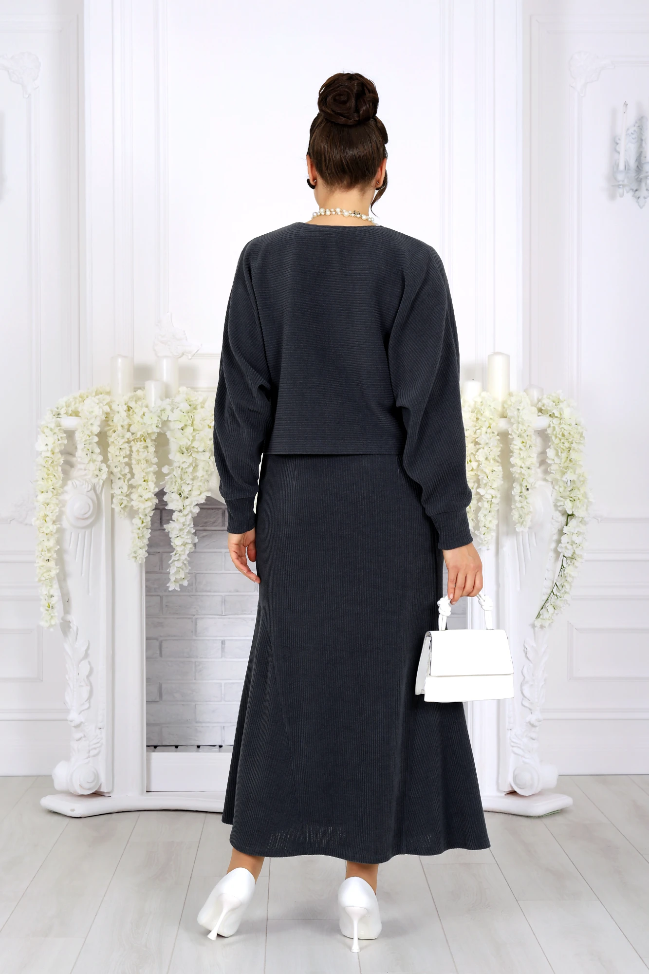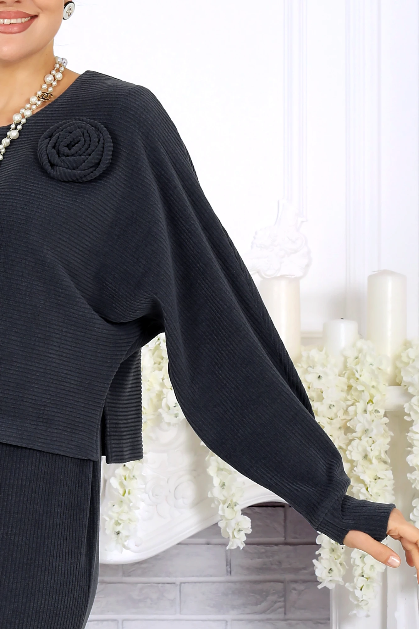 Практичный, стильный и по-настоящему универсальный костюм, который станет базой вашего гардероба и будет радовать не один сезон. Этот костюм создан для женщин, которые ценят комфорт, аккуратную посадку и продуманный дизайн. Фактурный трикотаж с рубчиком мягко ложится по фигуре, визуально вытягивает силуэт и не сковывает движений. Модель отлично подходит для женщин с формами и уверенно смотрится в больших размерах. Платье полуприлегающего силуэта красиво подчеркивает линии фигуры, а притачные клинья по бокам создают плавное расширение к низу, обеспечивая свободу шага и женственный силуэт. Удобная длина делает образ уместным как для деловой обстановки, так и для прогулок или встреч. Свободный джемпер добавляет образу уюта и многослойности: его можно носить поверх платья или отдельно. Разрезы по бокам, мягкая горловина и манжеты с вырезом для большого пальца создают современный, продуманный образ. Съемный декоративный цветок позволяет менять настроение комплекта — от лаконичного до более нарядного.